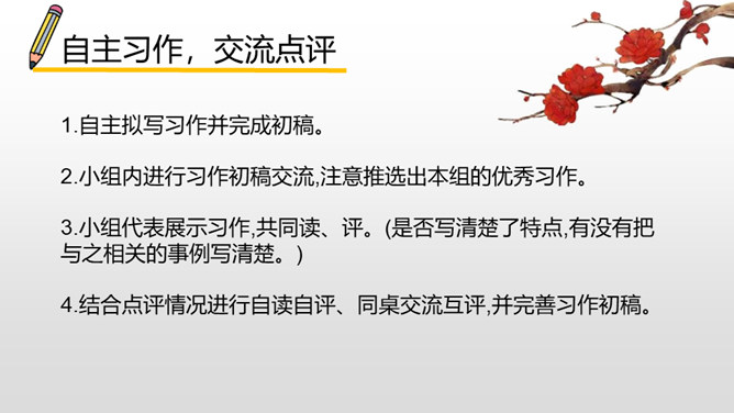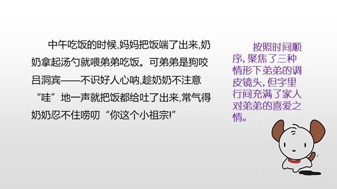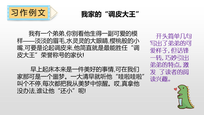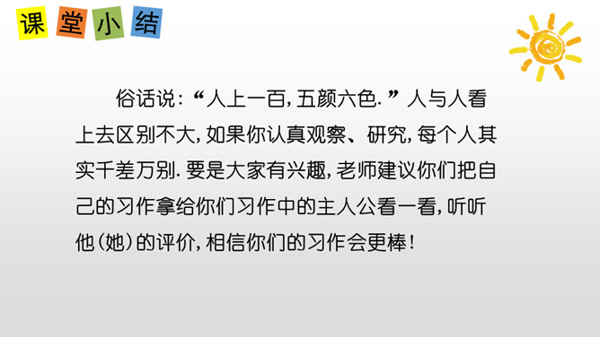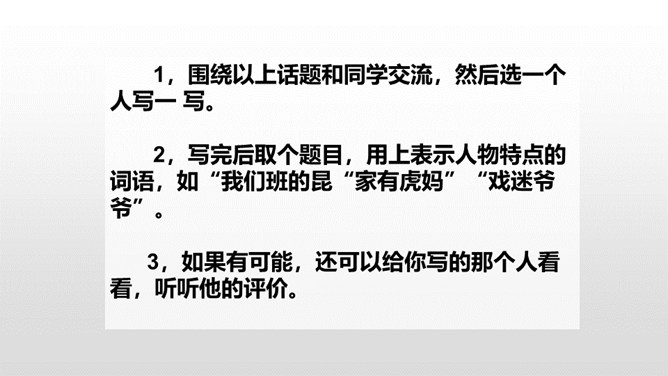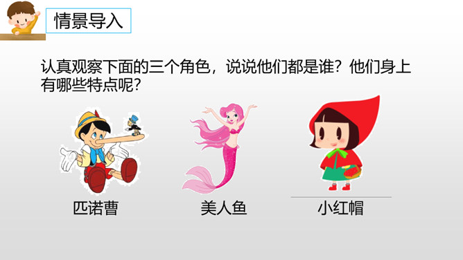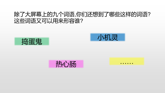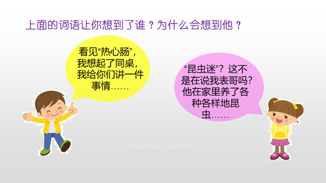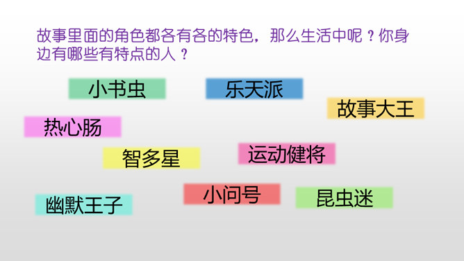 认真观察下面的三个角色,说说他们都是谁?他们身上有哪些特点呢?故事里面的角色都各有各的特色,那么生活中呢?你身边有哪些有特点的人?上面的词语让你想到了谁?为什么会想到他?看见“热心肠”,我想起了同桌,我给你们讲一件事情……“昆虫迷”?这不是在说我表哥吗?他在家里养了各种各样地昆虫……除了大屏幕上的九个词语,你们还想到了哪些这样的词语? 这些词语又可以用来形容谁?所属专题:身边那些有特点的人ppt。