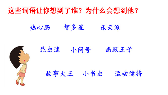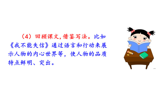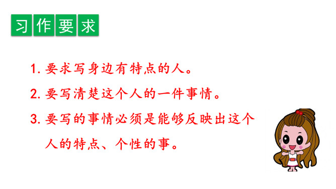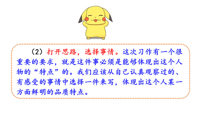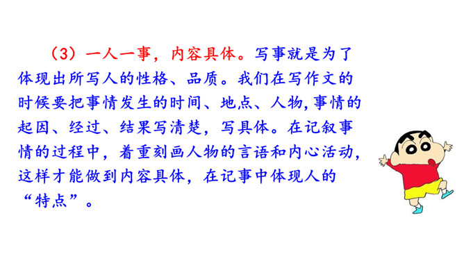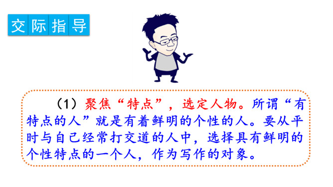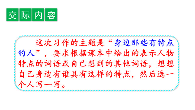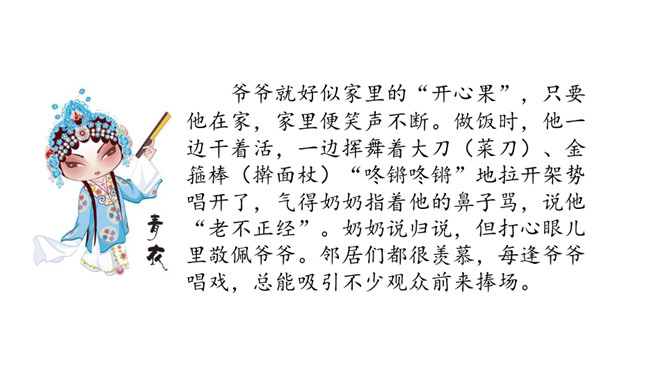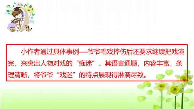 小作者通过具体事例——爷爷唱戏摔伤后还要求继续把戏演完,来突出人物对戏的“痴迷”。其语言通顺,内容丰富,条理清晰,将爷爷“戏迷”的特点展现得淋漓尽致。回顾课文,借鉴写法。比如《我不能失信》通过语言和行动来展示人物的内心世界等,使人物的品质特点鲜明、突出。一人一事,内容具体。写事就是为了体现出所写人的性格、品质。我们在写作文的时候要把事情发生的时间、地点、人物,事情的起因、经过、结果写清楚,写具体。在记叙事情的过程中,着重刻画人物的言语和内心活动,这样才能做到内容具体,在记事中体现人的“特点”。所属专题:身边那些有特点的人ppt。