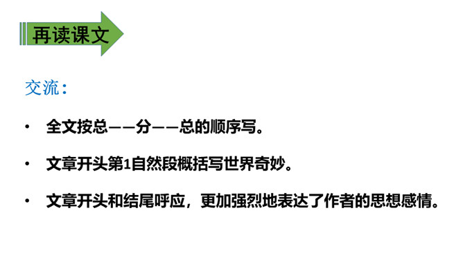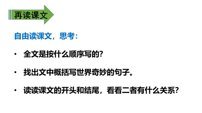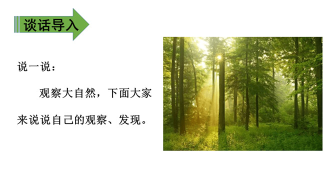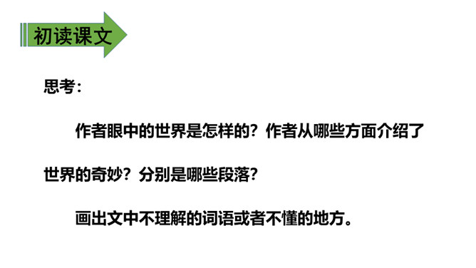 1.会认8个生字,会写13个生字。(重点)2.正确、流利、有感情地朗读课文。(重点)3.理解课文内容,了解世界的奇妙所在,体会文章的思想感情。(难点)4.领悟作者的表达方法,学习作者按一定顺序抓住事物特点描写的写作方法。(难点)1.会认8个生字,会写13个生字。(重点)2.正确、流利、有感情地朗读课文。(重点)说一说:观察大自然,下面大家来说说自己的观察、发现。所属专题:我们奇妙的世界ppt。