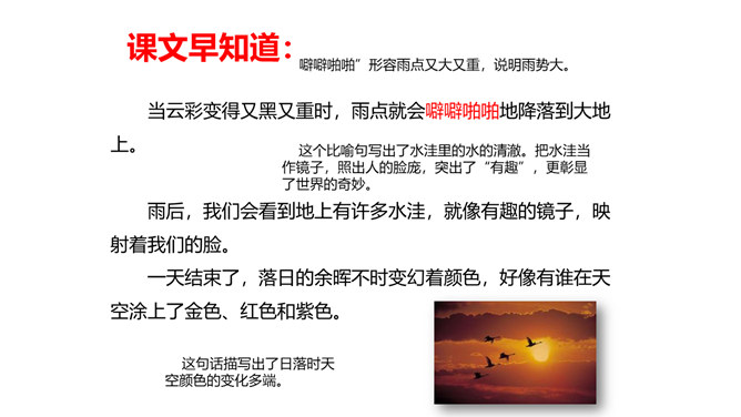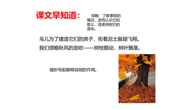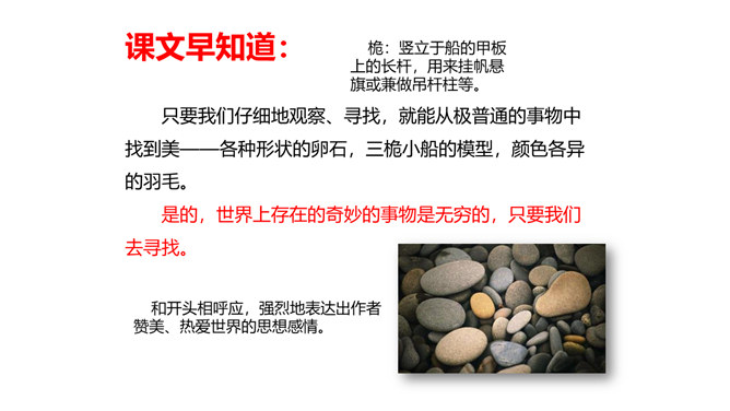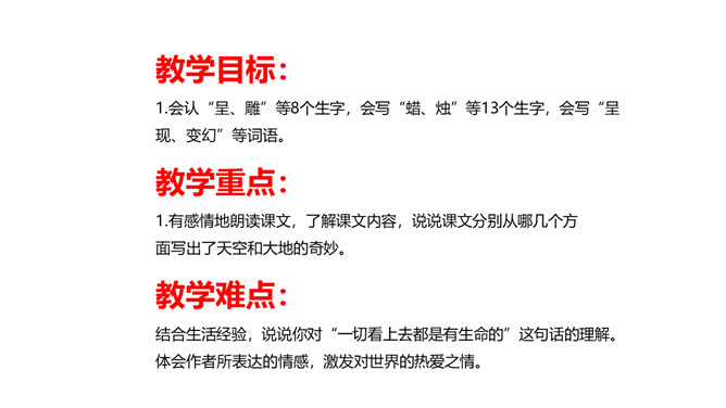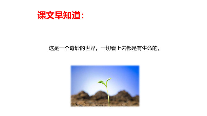 结合生活经验,说说你对“一切看上去都是有生命的”这句话的理解。我们的生活中,动植物都是鲜活的生命,是有生命力的。还有一些事物虽然没有生命力,但是只要我们赋予它们感情和特殊的意义,它们在我们的眼中也会成为一个个鲜活的生命,如一张小板凳,它原本没有生命力,我们可以通过联想,当它还是一课大树时,有着顽强的生命力;还可以通过它为我们人类服务,成为我们生活中不可或缺的部分来赋予它生命力。所属专题:我们奇妙的世界ppt。