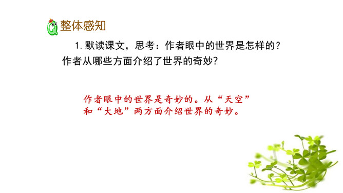 默读课文,思考:作者眼中的世界是怎样的?作者从哪些方面介绍了世界的奇妙?作者眼中的世界是奇妙的。从“天空”和“大地”两方面介绍世界的奇妙。天空的日出、云彩、雨点、落日、星星,让我们感受到了世界的奇妙。表达了作者对大自然的热爱之情。最后两段与第1自然段是首尾照应关系。文末总结,与文首照应,更加强烈的表达了作者的思想感情。讨论:结合生活,说说你对“一切看上去都是有生命的”这句话的理解。所属专题:我们奇妙的世界ppt。