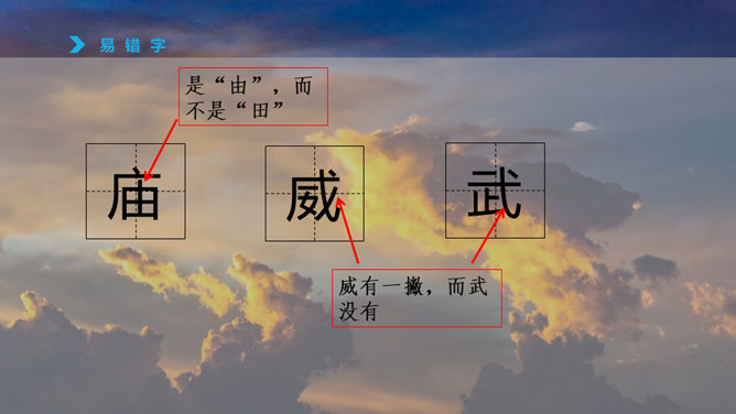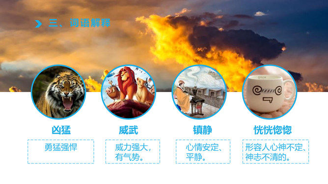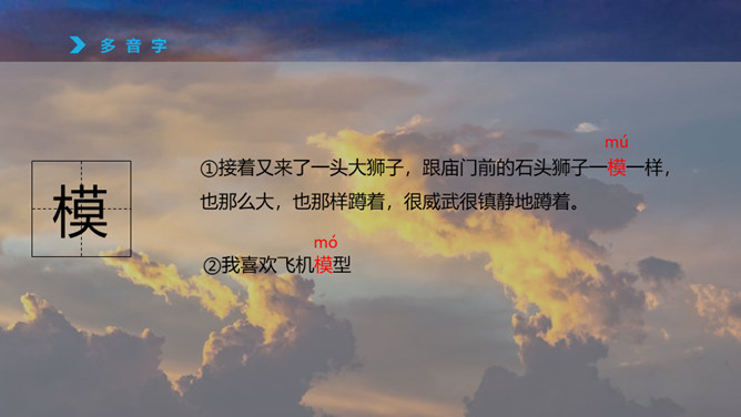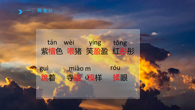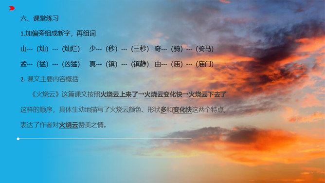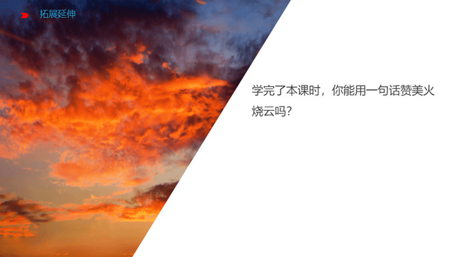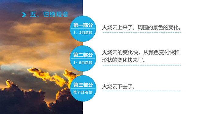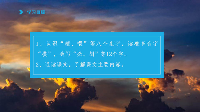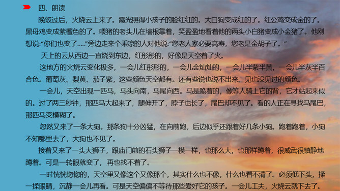 1、认识“檀、喂”等八个生字,读准多音字“模”,会写“必、胡”等12个字。2、通读课文,了解课文主要内容。火烧云上来了,周围的景色的变化。变化快,从颜色变化快和形状的变化快来写。火烧云下去了。这篇课文按照火烧云上来了→火烧云变化快→火烧云下去了这样的顺序,具体生动地描写了火烧云颜色、形状多和变化快这两个特点,表达了作者对火烧云赞美之情。所属专题:火烧云ppt。
