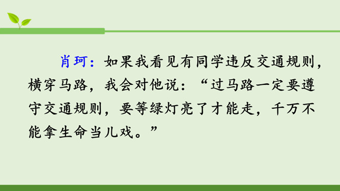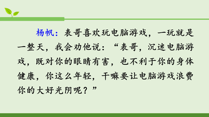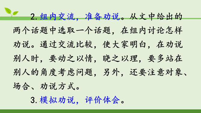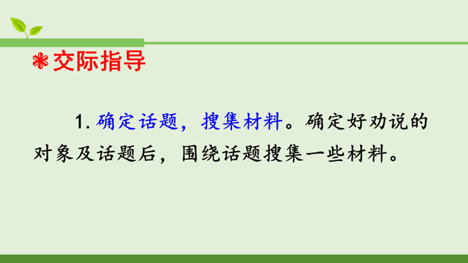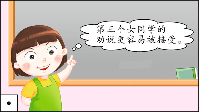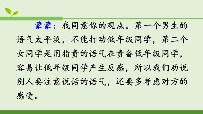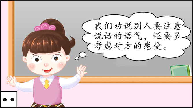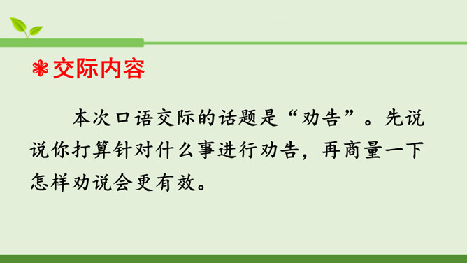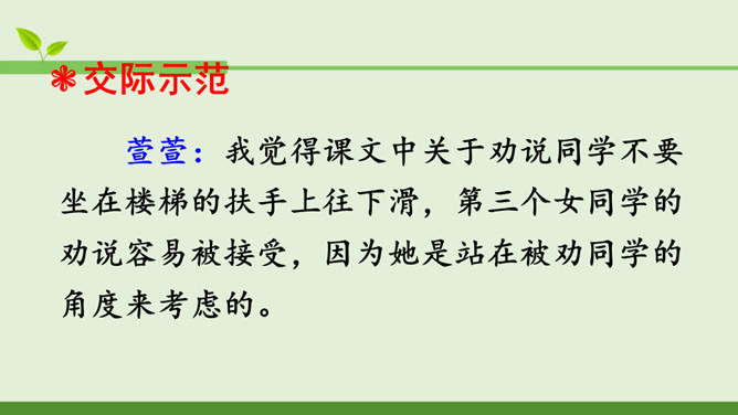 本次口语交际的话题是“劝告”。先说说你打算针对什么事进行劝告,再商量一下怎样劝说会更有效。萱萱:我觉得课文中关于劝说同学不要坐在楼梯的扶手上往下滑,第三个女同学的劝说容易被接受,因为她是站在被劝同学的角度来考虑的。蒙蒙:我同意你的观点。第一个男生的语气太平淡,不能打动低年级同学,第二个女同学是用指责的语气在责备低年级同学,容易让低年级同学产生反感,所以我们劝说别人要注意说话的语气,还要多考虑对方的感受。所属专题:劝说ppt。
