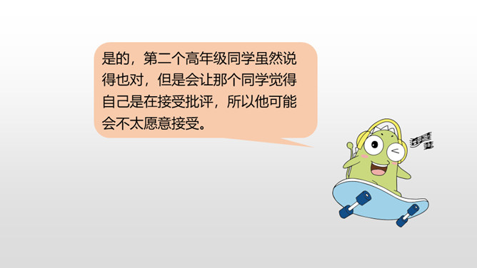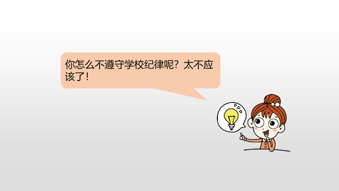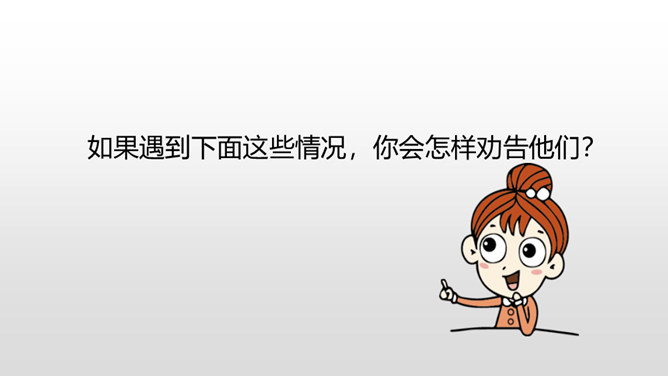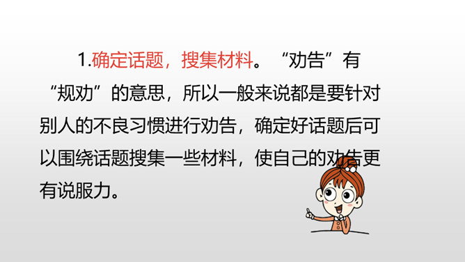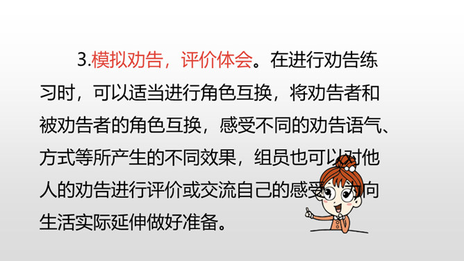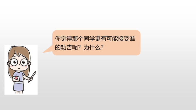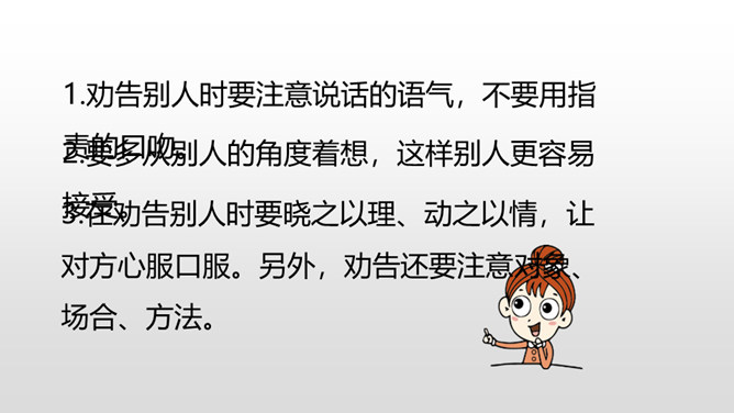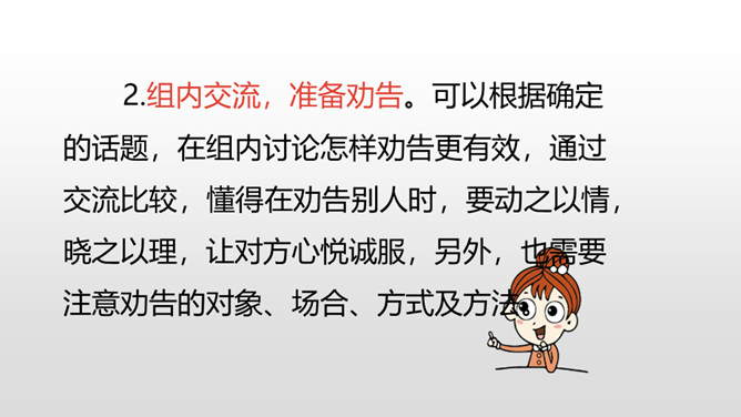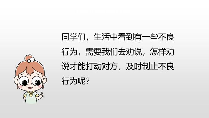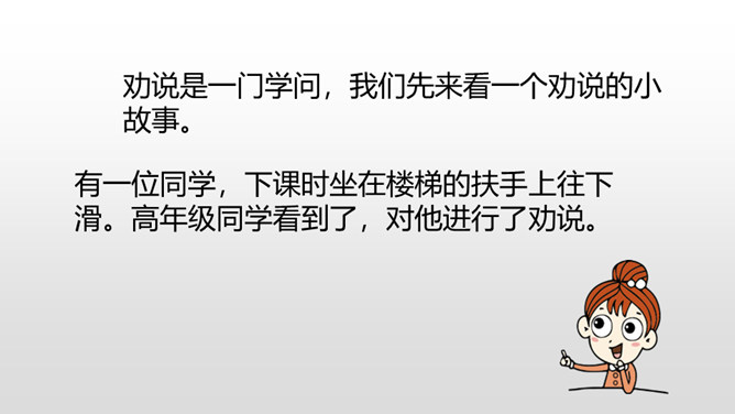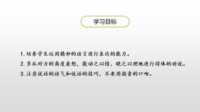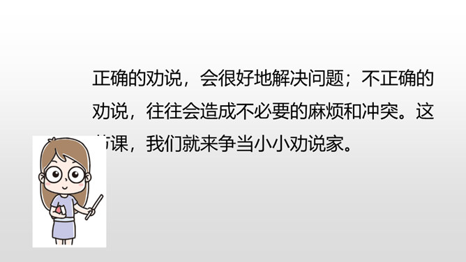 1.培养学生运用精妙的语言进行表达的能力。2.多从对方的角度着想,能动之以情、晓之以理地进行得体的劝说。3.注意说话的语气和说话的技巧,不要用指责的口吻。同学们,生活中看到有一些不良行为,需要我们去劝说,怎样劝说才能打动对方,及时制止不良行为呢?正确的劝说,会很好地解决问题;不正确的劝说,往往会造成不必要的麻烦和冲突。这节课,我们就来争当小小劝说家。所属专题:劝说ppt。