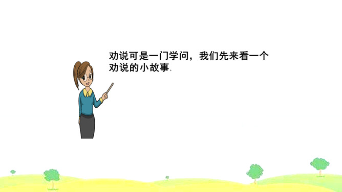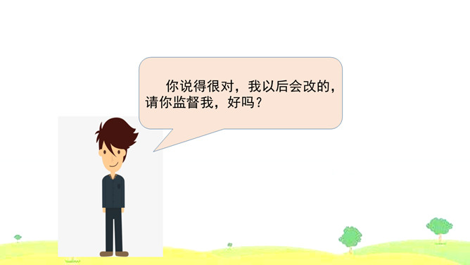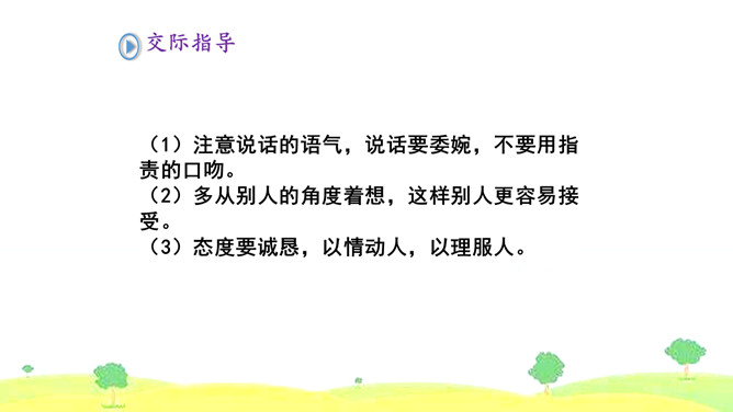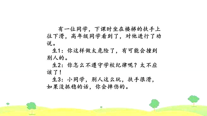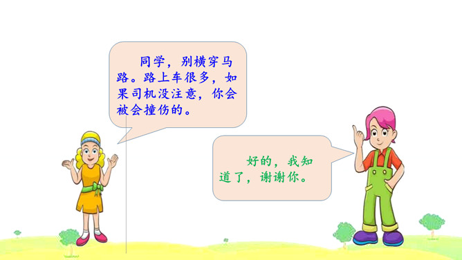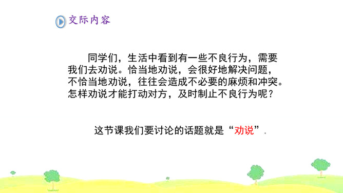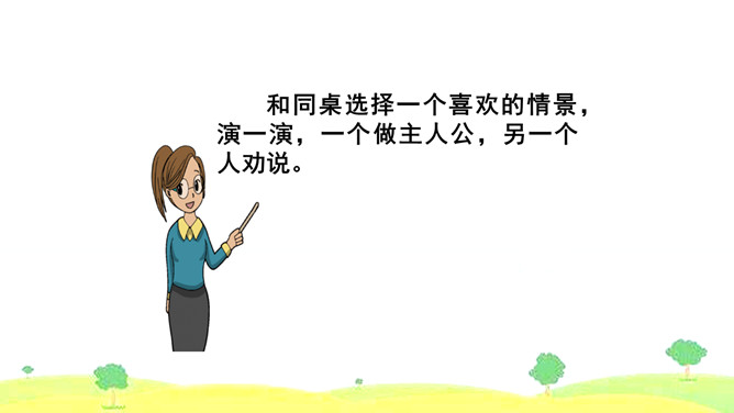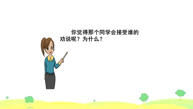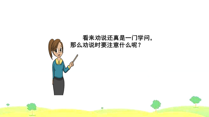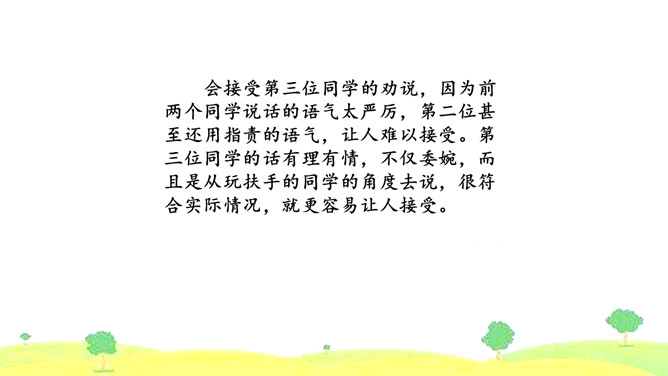 1.一边听一边思考:别人讲的是否有道理。2.尊重不同的观点。和同桌选择一个喜欢的情景,演一演,一个做主人公,另一个人劝说。同学,别横穿马路。路上车很多,如果司机没注意,你会被会撞伤的。好的,我知道了,谢谢你。表哥,你不要长时间玩电脑游戏啦,这样对你的眼睛不好,会近视的。而且坐着太久,对腰也不好。我们很担心你。你说得很对,我以后会改的,请你监督我,好吗?所属专题:劝说ppt。