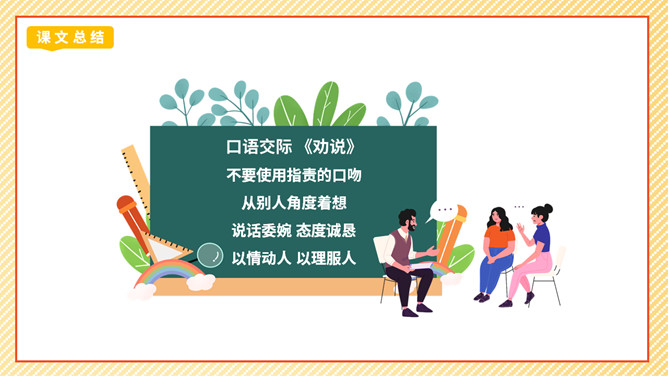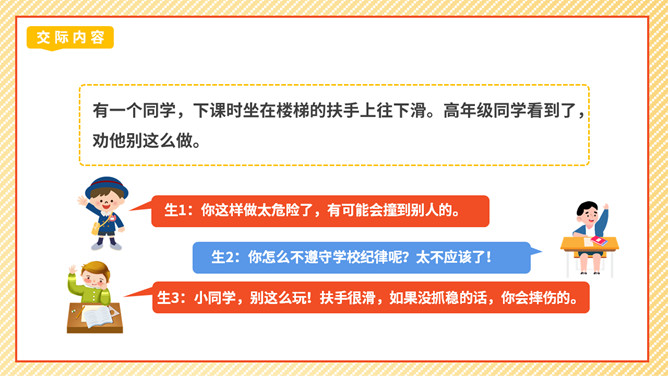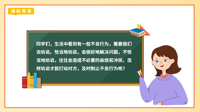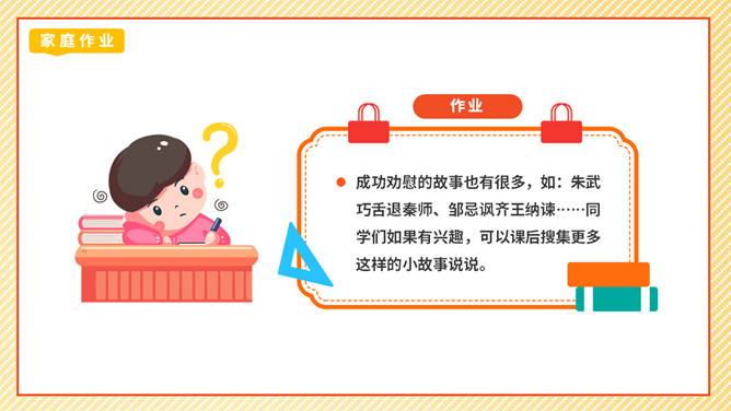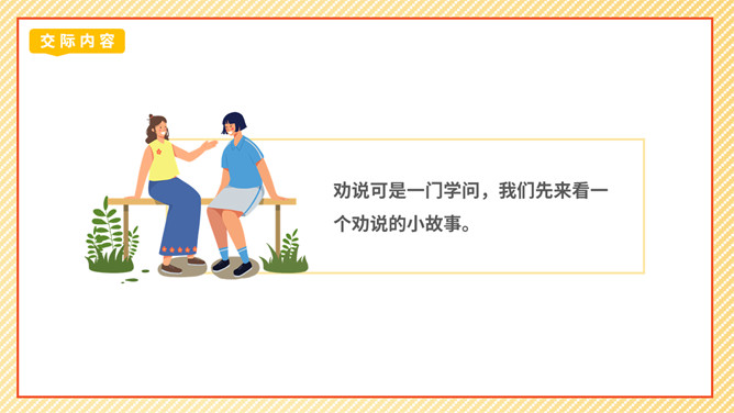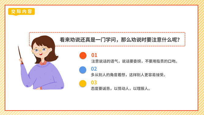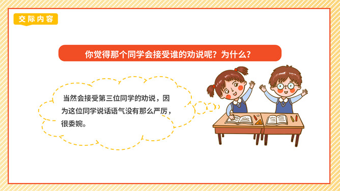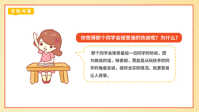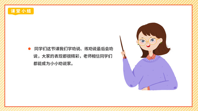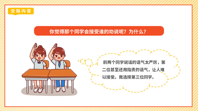 劝说可是一门学问,我们先来看一个劝说的小故事。同学们这节课我们学劝说、练劝说最后会劝说,大家的表现都很精彩,老师相信同学们都能成为小小劝说家。成功劝慰的故事也有很多,如:朱武巧舌退秦师、邹忌讽齐王纳谏……同学们如果有兴趣,可以课后搜集更多这样的小故事说说。你觉得那个同学会接受谁的劝说呢?为什么?那个同学会接受最后一位同学的劝说,因为她说的话,够委婉,而且是从玩扶手的同学的角度去说。所属专题:劝说ppt。