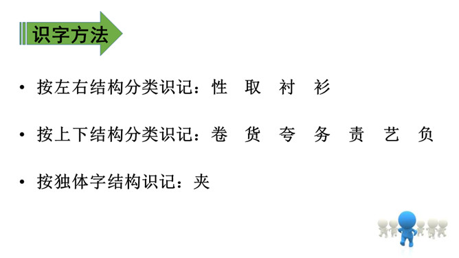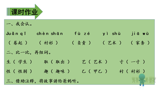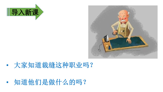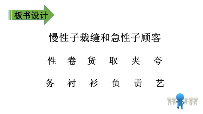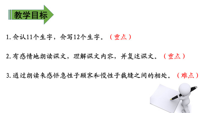 1.会认11个生字,会写12个生字。(重点)2.有感情地朗读课文,理解课文内容,并复述课文。(重点)3.通过朗读来感悟急性子顾客和慢性子裁缝之间的相处。(难点)会认11个生字,会写12个生字。(重点)大家知道裁缝这种职业吗?知道他们是做什么的吗?1. 教师指名认读生字。2. 学生说一说这节课学会了哪些字,教师选一组学生到黑板上模仿老师的板书写一遍生字,台下学生在自己的田字簿里进行书写。所属专题:慢性子裁缝和急性子顾客ppt。