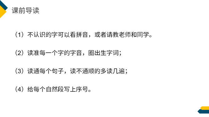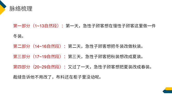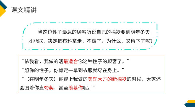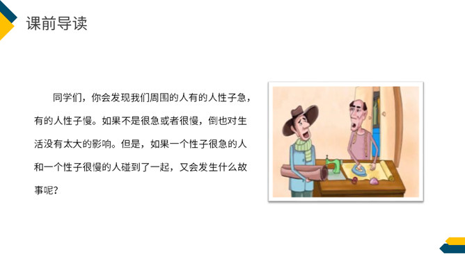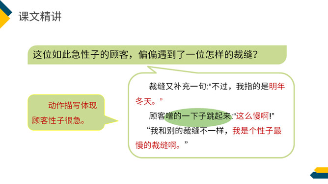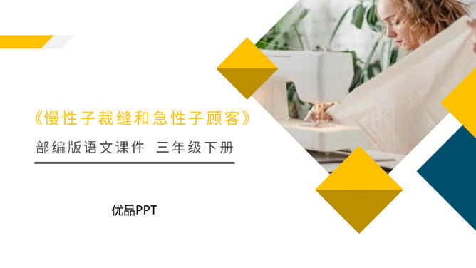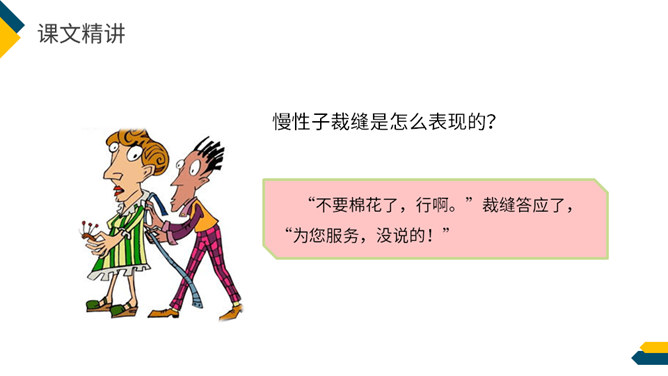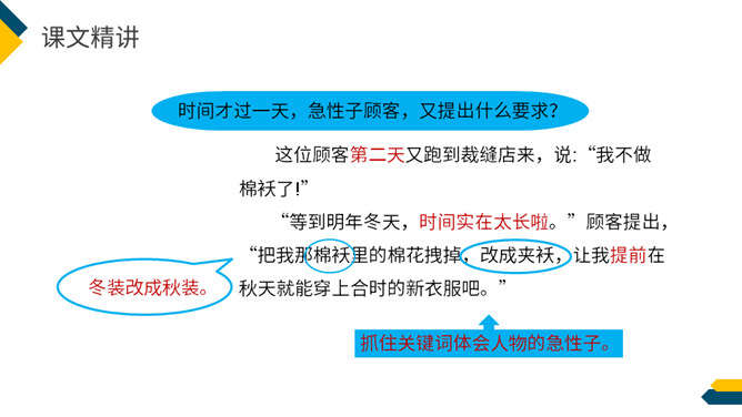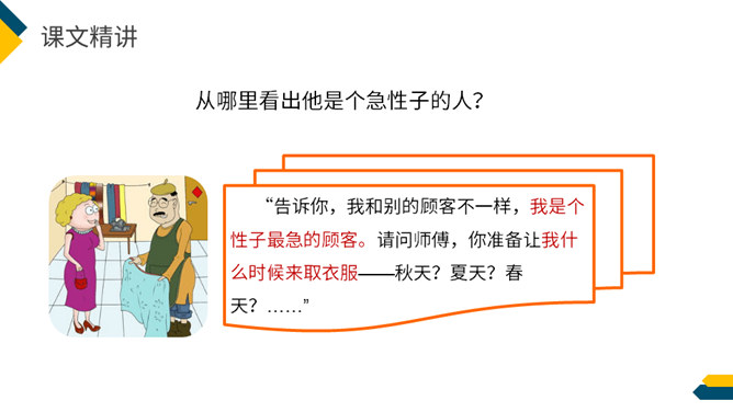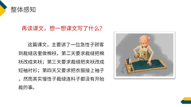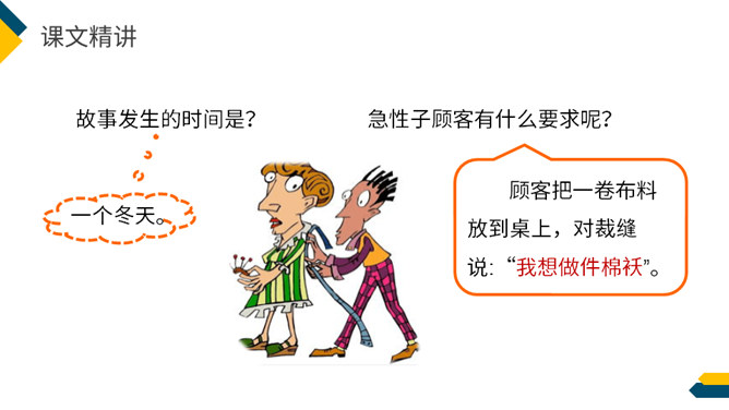 同学们,你会发现我们周围的人有的人性子急,有的人性子慢。如果不是很急或者很慢,倒也对生活没有太大的影响。但是,如果一个性子很急的人和一个性子很慢的人碰到了一起,又会发生什么故事呢?(1)不认识的字可以看拼音,或者请教老师和同学。(2)读准每一个字的字音,圈出生字词;(3)读通每个句子,读不通顺的多读几遍;(4)给每个自然段写上序号。这位如此急性子的顾客,偏偏遇到了一位怎样的裁缝?所属专题:慢性子裁缝和急性子顾客ppt。