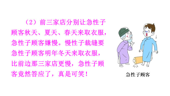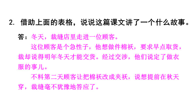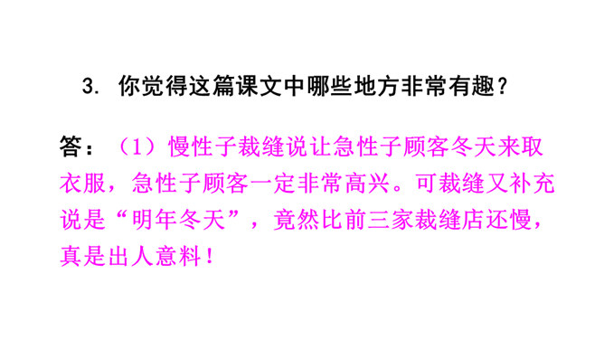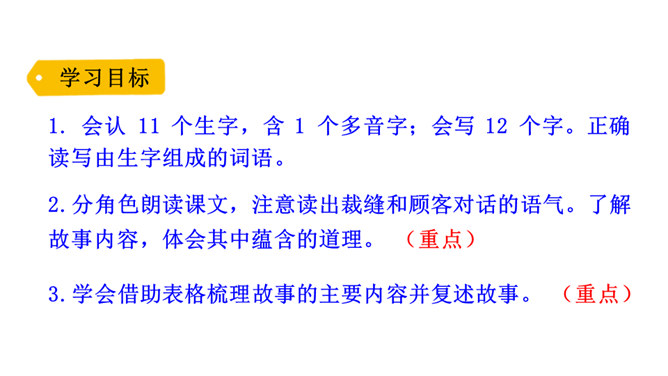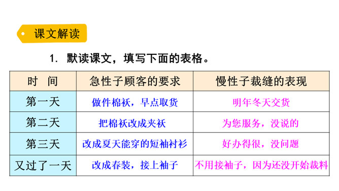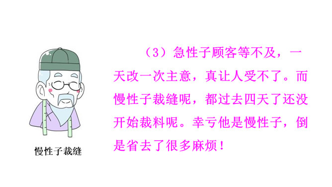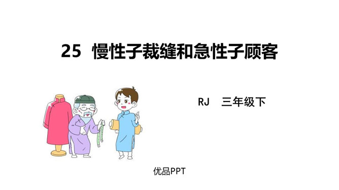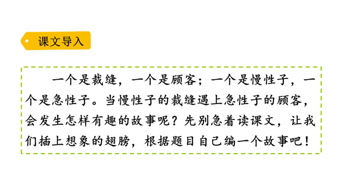 一个是裁缝,一个是顾客;一个是慢性子,一个是急性子。当慢性子的裁缝遇上急性子的顾客,会发生怎样有趣的故事呢?先别急着读课文,让我们插上想象的翅膀,根据题目自己编一个故事吧!1. 会认 11 个生字,含 1 个多音字;会写 12 个字。正确读写由生字组成的词语。2.分角色朗读课文,注意读出裁缝和顾客对话的语气。了解故事内容,体会其中蕴含的道理。3.学会借助表格梳理故事的主要内容并复述故事。所属专题:慢性子裁缝和急性子顾客ppt。