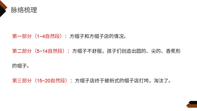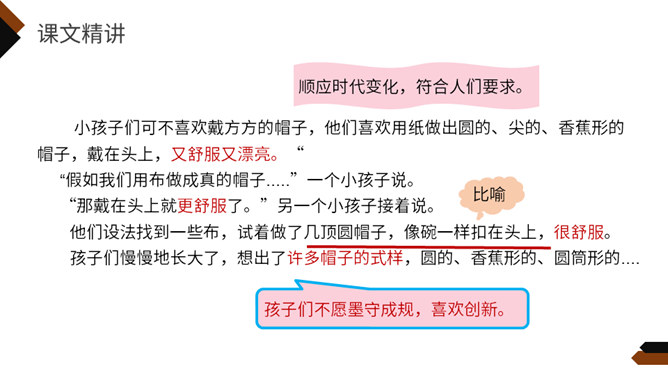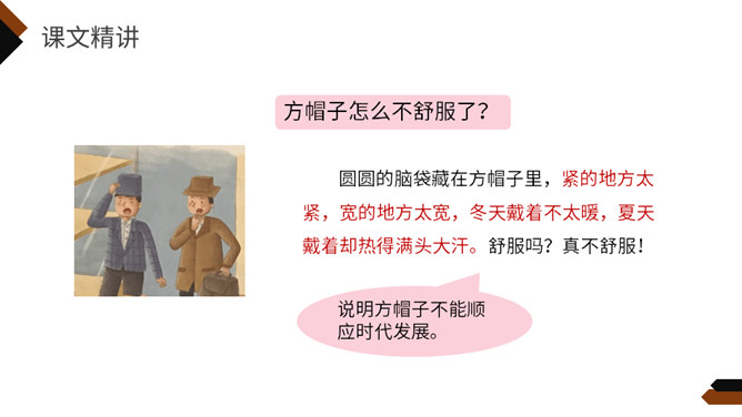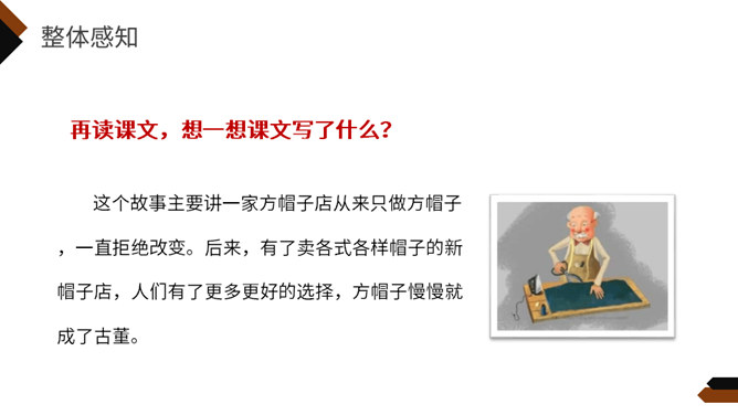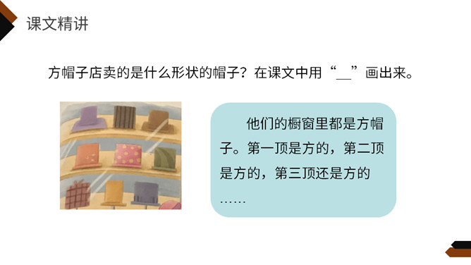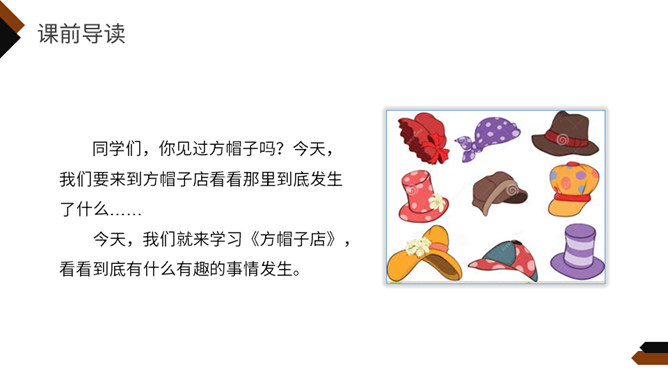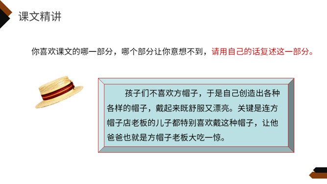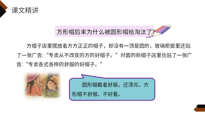 再读课文,想一想课文写了什么?这个故事主要讲一家方帽子店从来只做方帽子,一直拒绝改变。后来,有了卖各式各样帽子的新帽子店,人们有了更多更好的选择,方帽子慢慢就成了古董。你喜欢课文的哪一部分,哪个部分让你意想不到,请用自己的话复述这一部分。孩子们不喜欢方帽子,于是自己创造出各种各样的帽子,戴起来既舒服又漂亮。关键是连方帽子店老板的儿子都特别喜欢戴这种帽子,让他爸爸也就是方帽子老板大吃一惊。所属专题:方帽子店ppt。