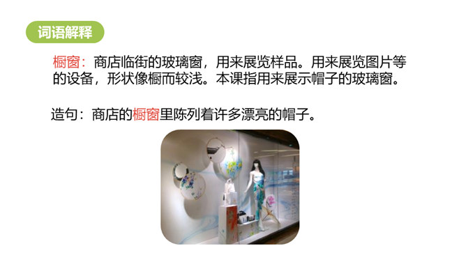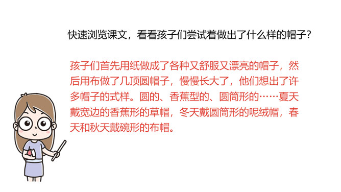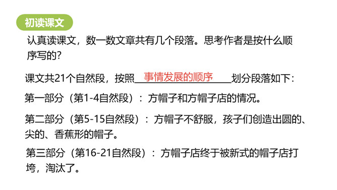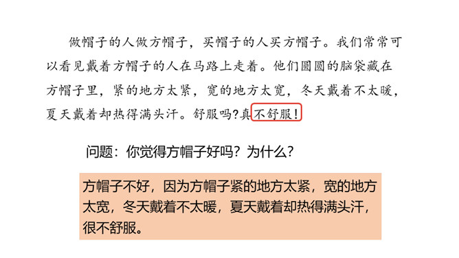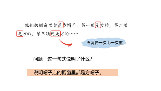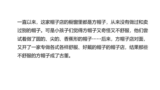 一直以来,这家帽子店的橱窗里都是方帽子,从来没有做过和卖过别的帽子。可是小孩子们觉得方帽子又奇怪又不舒服,他们尝试着做了圆的、尖的、香蕉形的帽子……后来,方帽子店对面,又开了一家专做各式各样舒服、好戴的帽子的帽子店,结果那些不舒服的方帽子成了古董。懂得世界在不断变化,我们也应该随着改变的道理。默读课文,了解故事的主要内容,能够复述故事。会认8个生字。掌握多音字。所属专题:方帽子店ppt。