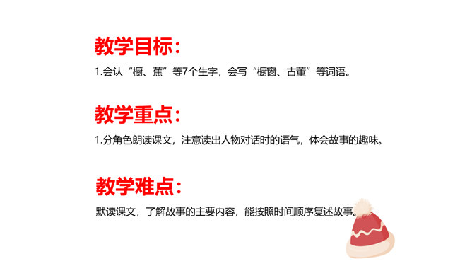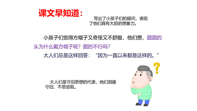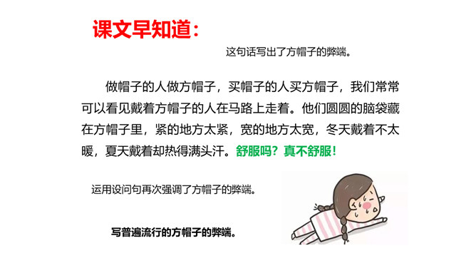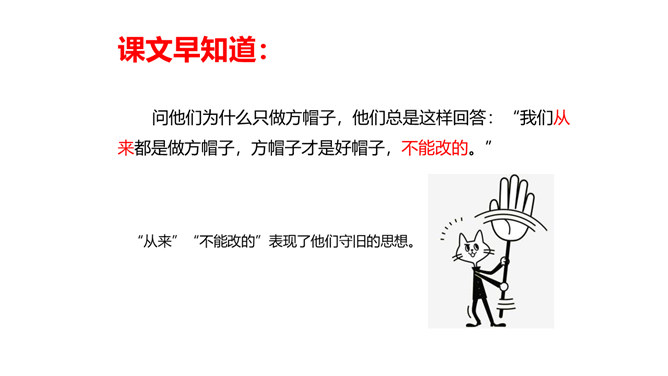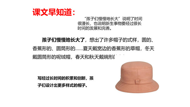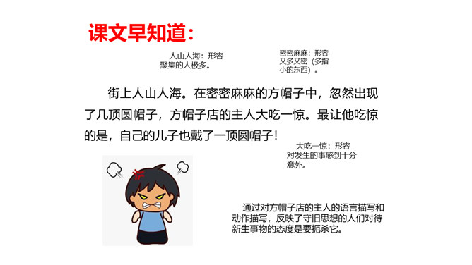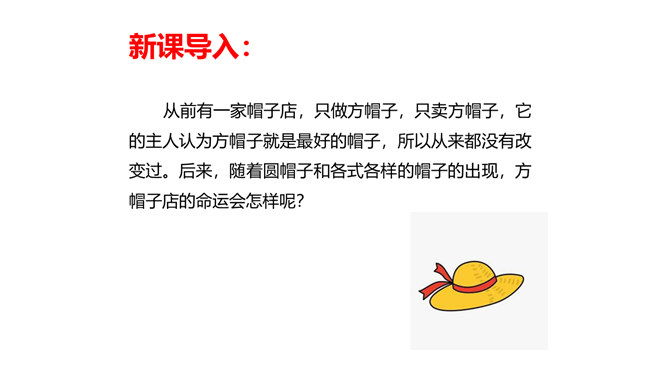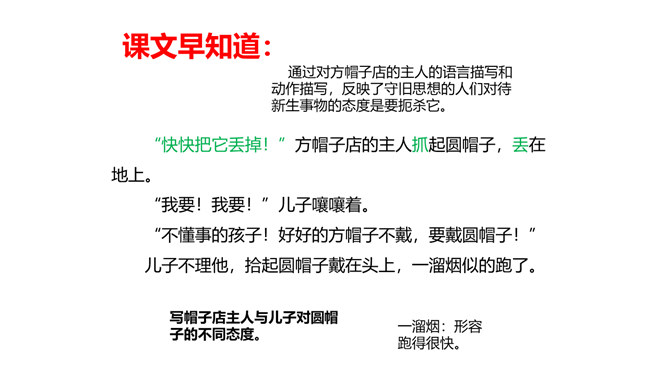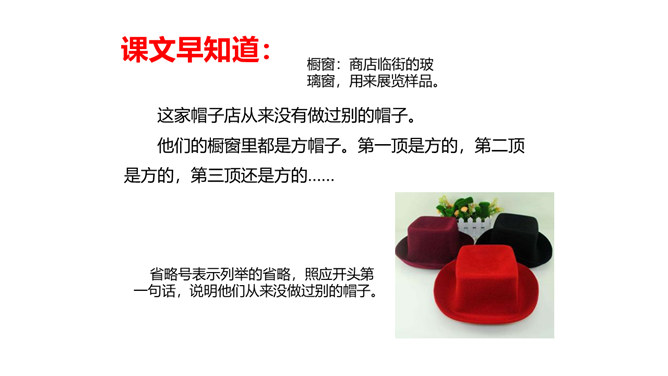 教学目标:1.会认“橱、蕉”等7个生字,会写“橱窗、古董”等词语。教学重点:1.分角色朗读课文,注意读出人物对话时的语气,体会故事的趣味。教学难点:默读课文,了解故事的主要内容,能按照时间顺序复述故事。省略号表示列举的省略,照应开头第一句话,说明他们从来没做过别的帽子。“从来”“不能改的”表现了他们守旧的思想。文中的大人们和小孩子们分别代表的是哪类人?所属专题:方帽子店ppt。