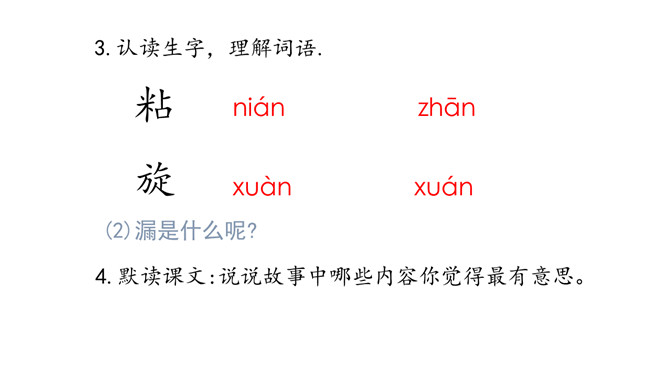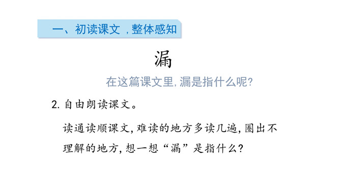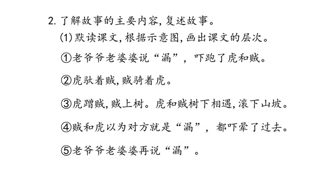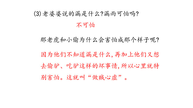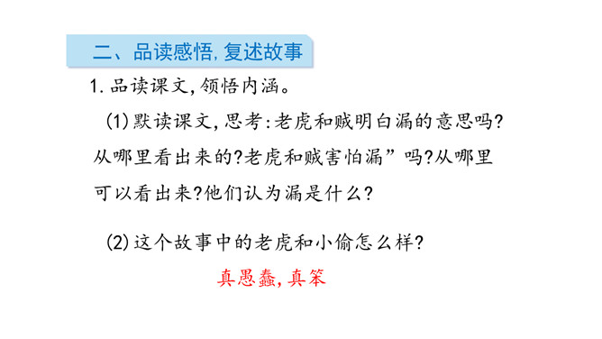 读通读顺课文,难读的地方多读几遍,圈出不理解的地方,想一想“漏”是指什么?自由朗读课文.想想故事是按照怎样的顺序写的,可以分为几部分?故事是按照事情发展的顺序写的,可以分为三部分:一、故事的开始。(第1、第2自然段)二、故事的经过。(第3至第18自然段)三、故事的结局。(第19至第20自然段)品读课文,领悟内涵。默读课文,思考:老虎和贼明白漏的意思吗?从哪里看出来的?老虎和贼害怕漏”吗?从哪里可以看出来?他们认为漏是什么?所属专题:漏ppt。