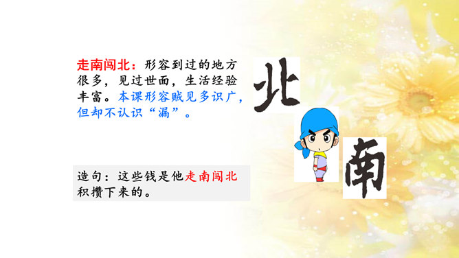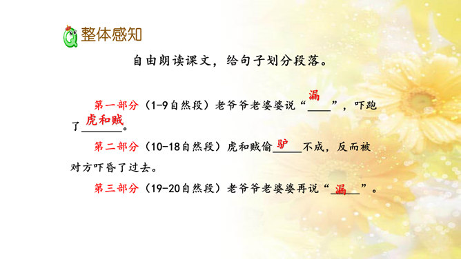 自由朗读第1-2自然段,想一想:1.这个故事里有谁?2.这时,谁来了?他们看见小胖驴会想些什么?自由朗读第3-11自然段,想一想:老虎和贼他们认为“漏”是什么呢?用自己的话说一说。自由朗读最后两个自然段,想一想:“老婆婆说,‘管他狼哩,管他虎哩,我什么都不怕,就怕漏!’老婆婆怕什么?那“漏”是什么呢?老爷爷和老婆婆最怕漏雨,是不是也可能因为那里社会黑暗,他们的钱都被腐败的大官们收走了,而自己又年老体弱,没办法去修缮房屋呢?所属专题:漏ppt。