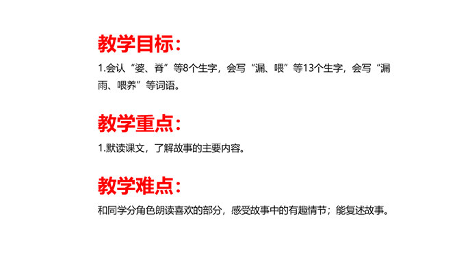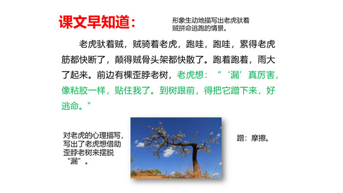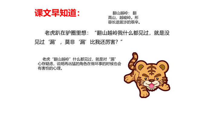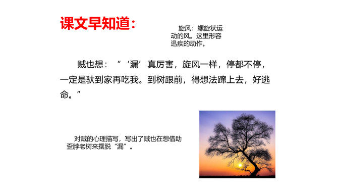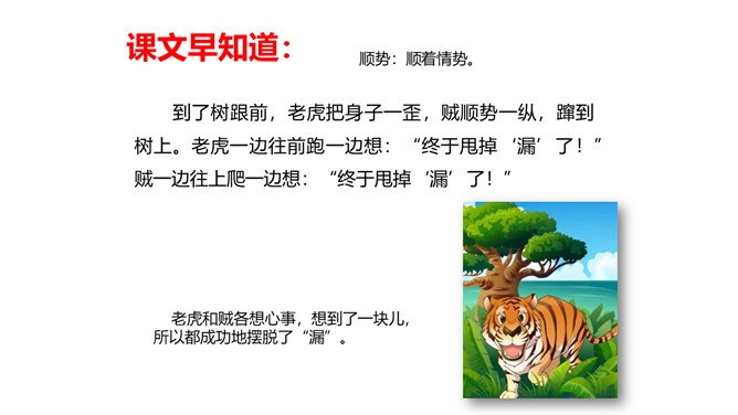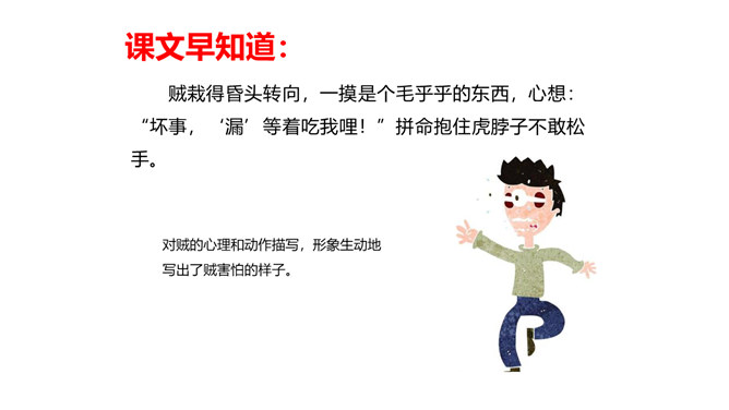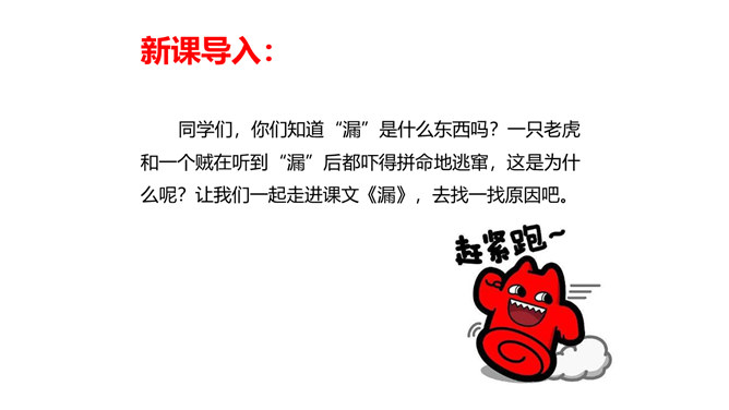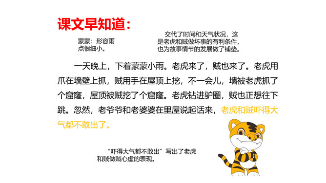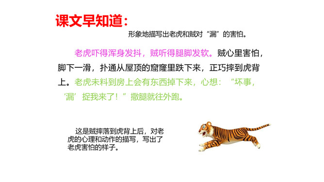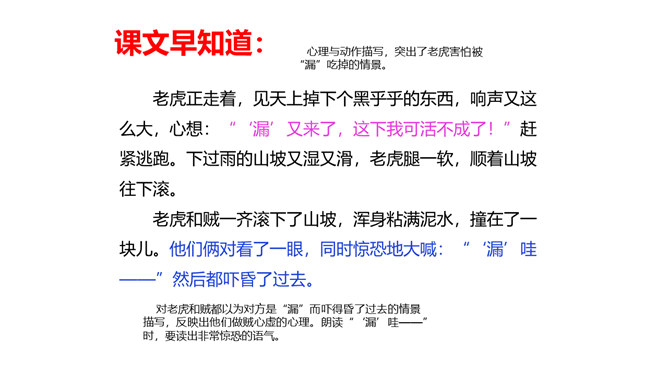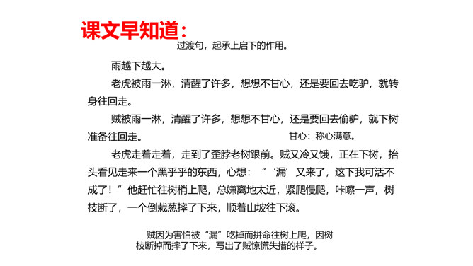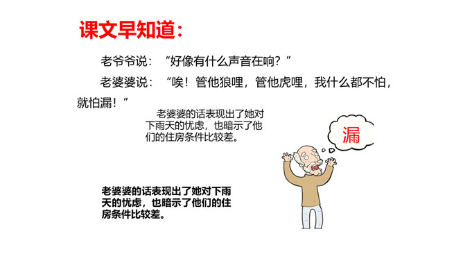 老虎和贼相互看清对方了吗?他们为什么都会吓得昏过去?没有。因为他们都处于恐惧之中,都错把对方当成了“漏”,都以为自己会被“漏”吃掉,所以都吓昏了。课文中几次提到了雨?这样写起什么作用?三次提到雨。第一次是“蒙蒙小雨”;第二次是“雨大了起来”,第三次是“雨越下越大”,雨势成为推动故事情节发展的客观条件。老婆婆口中的“漏”到底是什么?读完全文,你有什么感想?所属专题:漏ppt。