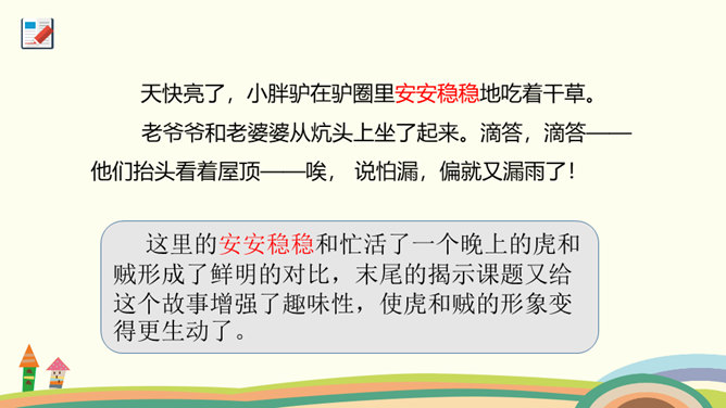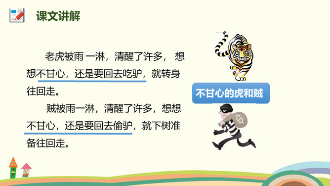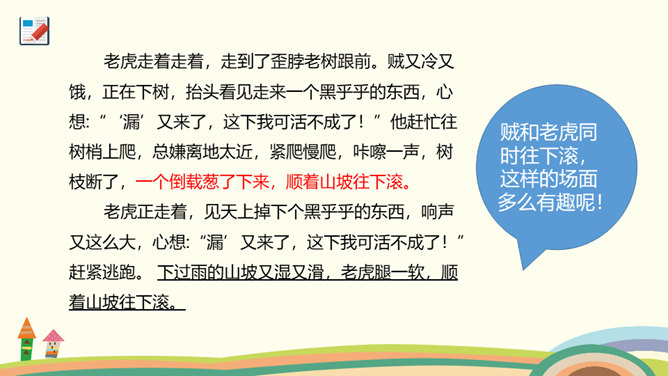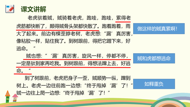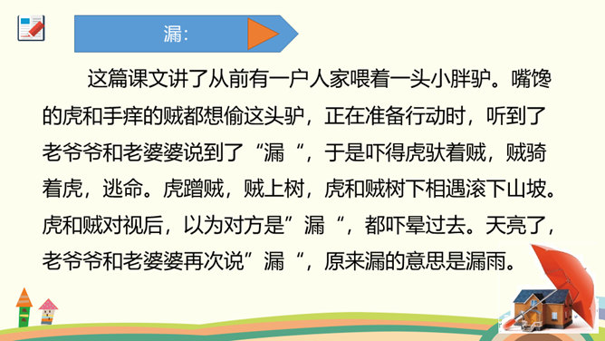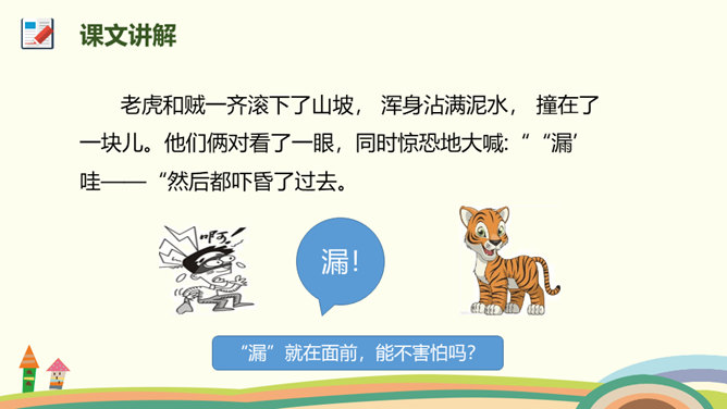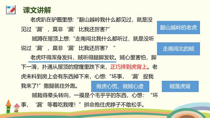 这篇课文讲了从前有一户人家喂着一头小胖驴。嘴馋的虎和手痒的贼都想偷这头驴,正在准备行动时,听到了老爷爷和老婆婆说到了“漏“,于是吓得虎驮着贼,贼骑着虎,逃命。虎蹭贼,贼上树,虎和贼树下相遇滚下山坡。虎和贼对视后,以为对方是”漏“,都吓晕过去。天亮了,老爷爷和老婆婆再次说”漏“,原来漏的意思是漏雨。默读课文,说说故事中哪些内容你觉得最有趣?所属专题:漏ppt。