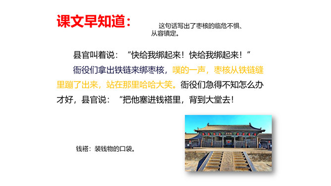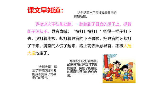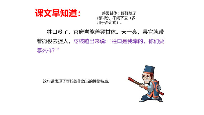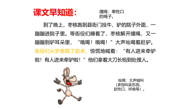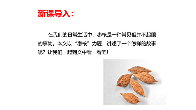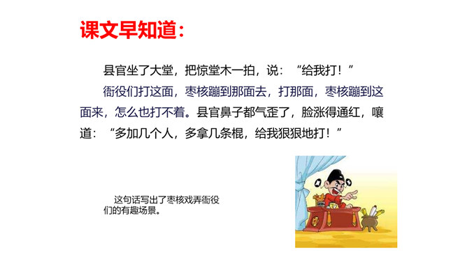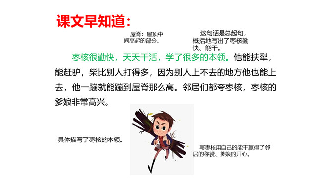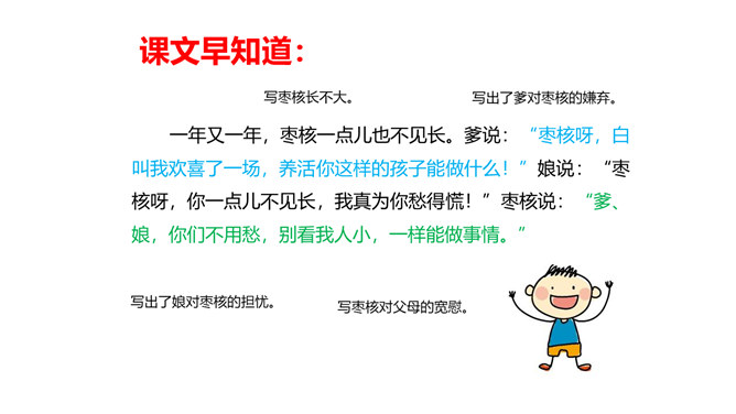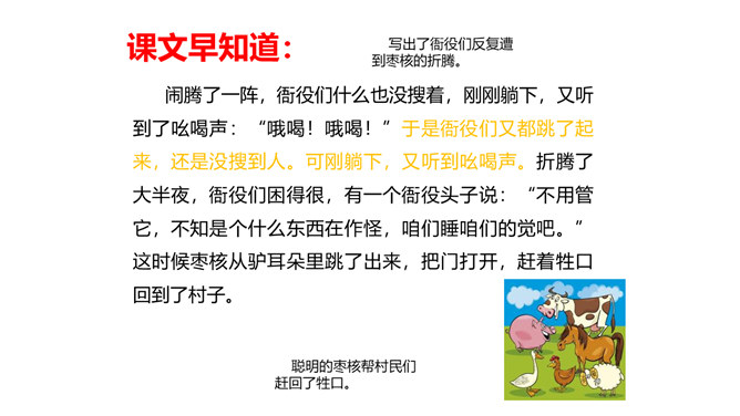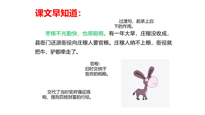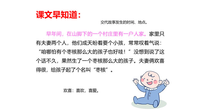 因为他的父母盼着有小孩的时候说有个枣核那么大的孩子也好,不久果然生下个枣核那么大的孩子,于是就给他起名叫“枣核”。枣核长大后还是只有枣核那么大。他爹认为养他那么大的孩子没用,他娘为他长不大而发愁。枣核能扶犁,能赶驴,柴比别人打得多,能蹦得很高。邻居们都夸他能干。晚上,枣核跳进县衙门拴牛、驴的院子,解开缰绳,蹦进驴耳朵里,吆喝着赶驴,衙役们被吵醒,却搜不到人,刚一睡下又被吵醒,如此反复。所属专题:枣核ppt。