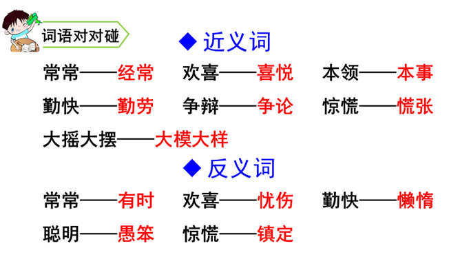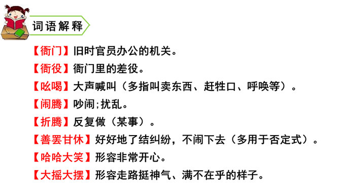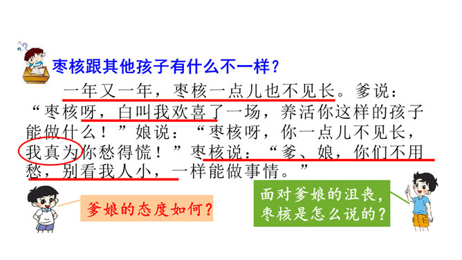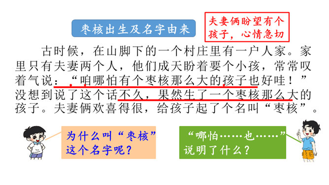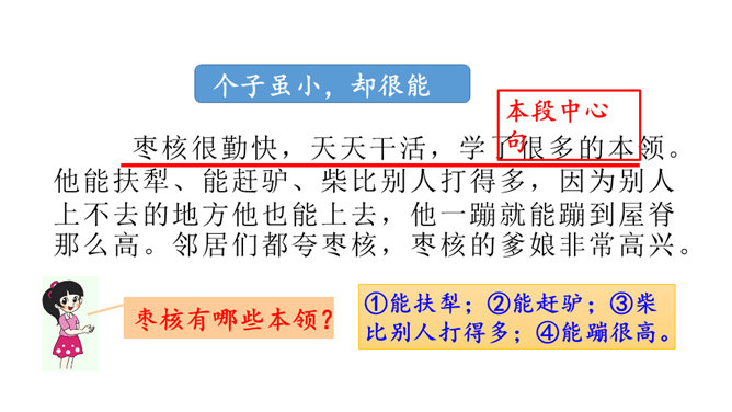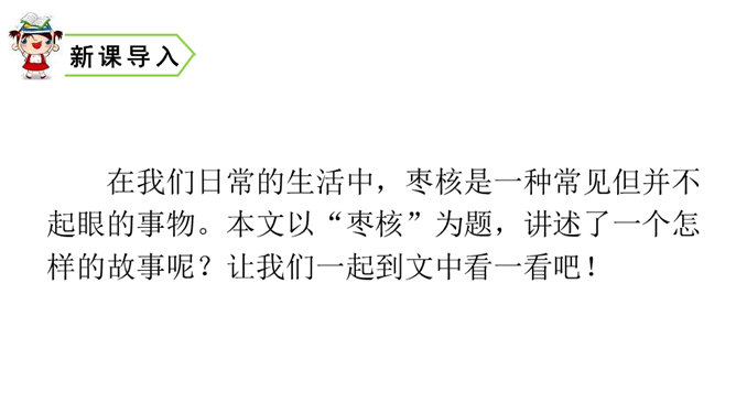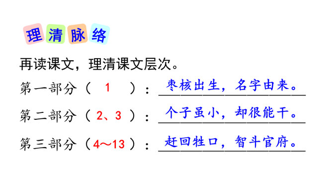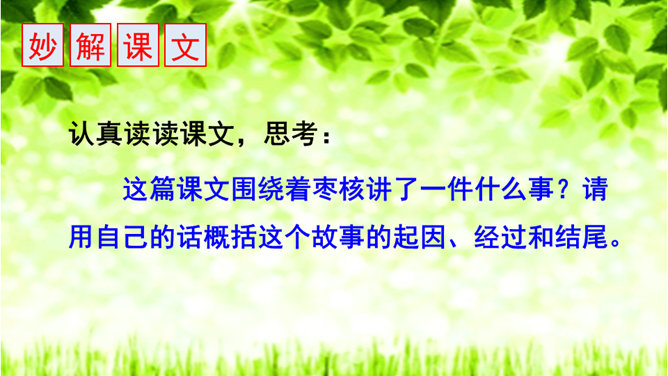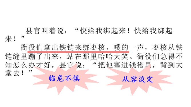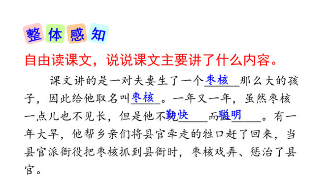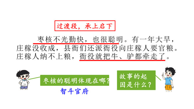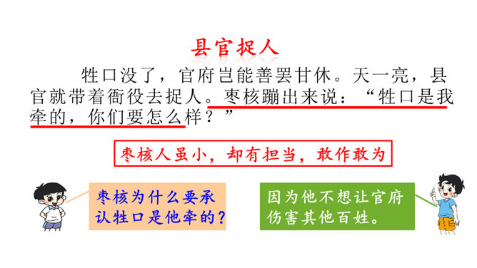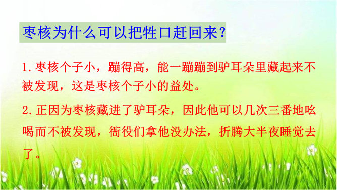一次枣核戏弄了衙役,惩治了县官,可是以后会怎样呢?你是否会为枣核将来的命运担忧?请同学们发挥想象,续编故事,看看谁编得好。枣核为什么可以把牲口赶回来?1.枣核个子小,蹦得高,能一蹦蹦到驴耳朵里藏起来不被发现,这是枣核个子小的益处。2.正因为枣核藏进了驴耳朵,因此他可以几次三番地吆喝而不被发现,衙役们拿他没办法,折腾大半夜睡觉去了。请用自己的话概括这个故事的起因、经过和结尾。所属专题:枣核ppt。
