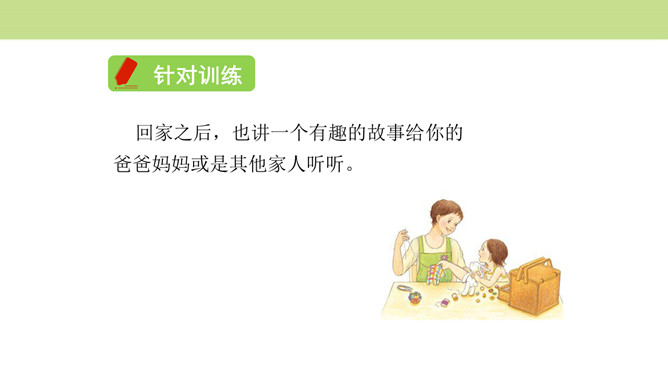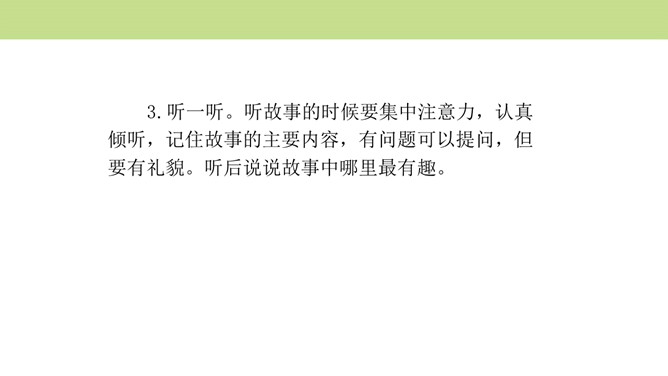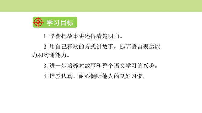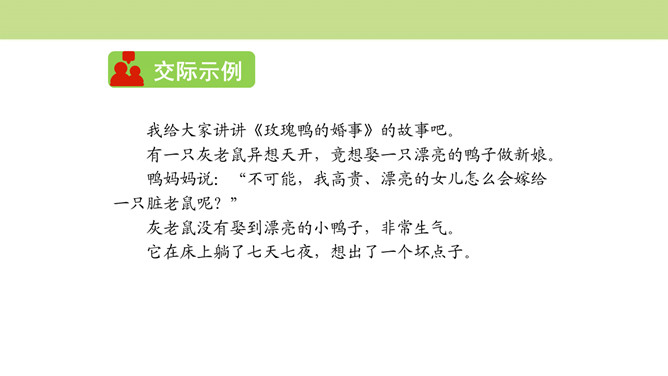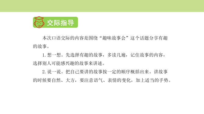 1.学会把故事讲述得清楚明白。2.用自己喜欢的方式讲故事,提高语言表达能力和沟通能力。 3.进一步培养对故事和整个语文学习的兴趣。4.培养认真、耐心倾听他人的良好习惯。本次口语交际的内容是分享有趣的故事。1.想一想。先选择有趣的故事,多读几遍,记住故事的内容,选择别人可能感兴趣的故事来讲述。2.说一说。把自己要讲的故事按一定的顺序概括出来。讲故事的时候要自然、大方,要注意语气、表情的变化,加上适当的手势。所属专题:趣味故事会ppt。