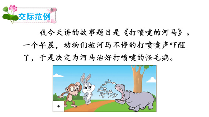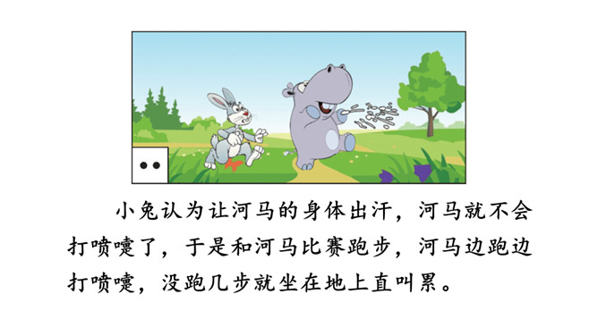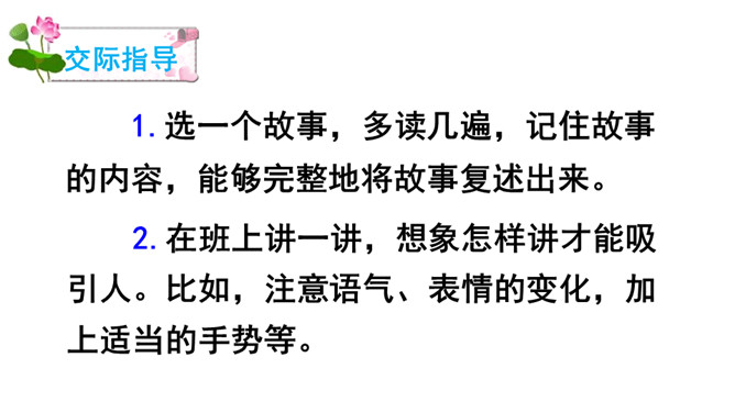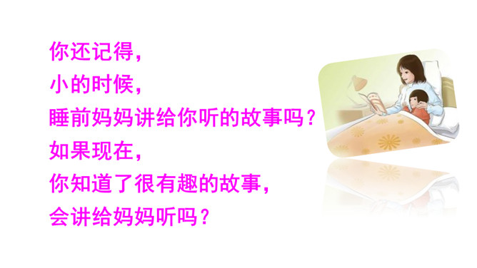 你还记得,小的时候,睡前妈妈讲给你听的故事吗?如果现在,你知道了很有趣的故事,会讲给妈妈听吗?相信我们都喜欢听有趣的故事,开心的也好、悲伤的也罢,能让听故事的人意犹未尽,这个有趣的故事就算讲成功了。讲故事的时候要自然、大方。听故事的时候要集中注意力,认真听。听后说说故事中哪个情节最有趣。在班上讲一讲,想象怎样讲才能吸引人。比如,注意语气、表情的变化,加上适当的手势等。所属专题:趣味故事会ppt。