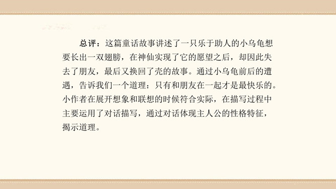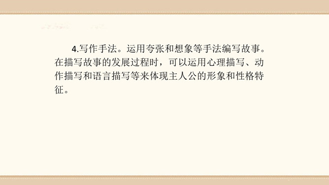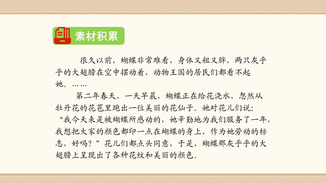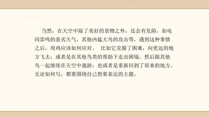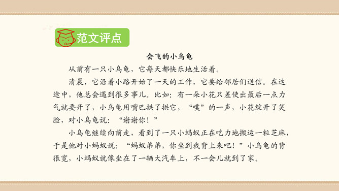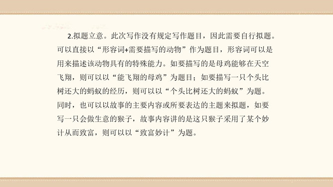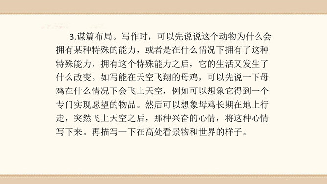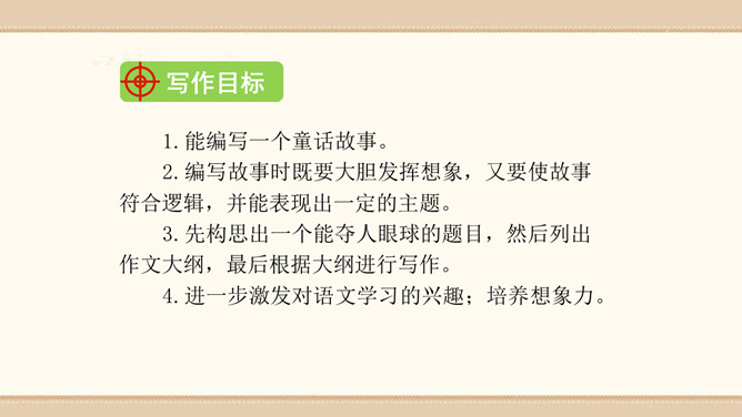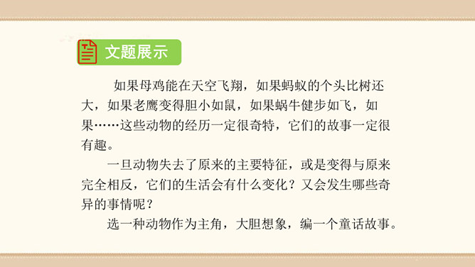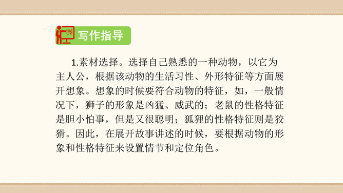 素材选择。选择自己熟悉的一种动物,以它为主人公,根据该动物的生活习性、外形特征等方面展开想象。想象的时候要符合动物的特征,如,一般情况下,狮子的形象是凶猛、威武的;老鼠的性格特征是胆小怕事,但是又很聪明;狐狸的性格特征则是狡猾。因此,在展开故事讲述的时候,要根据动物的形象和性格特征来设置情节和定位角色。1.能编写一个童话故事。2.编写故事时既要大胆发挥想象,又要使故事符合逻辑,并能表现出一定的主题。3.先构思出一个能夺人眼球的题目,然后列出作文大纲,最后根据大纲进行写作。所属专题:这样想象真有趣ppt。