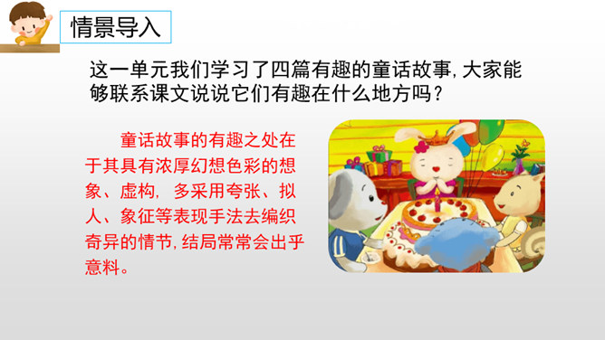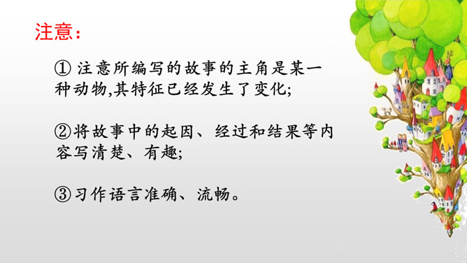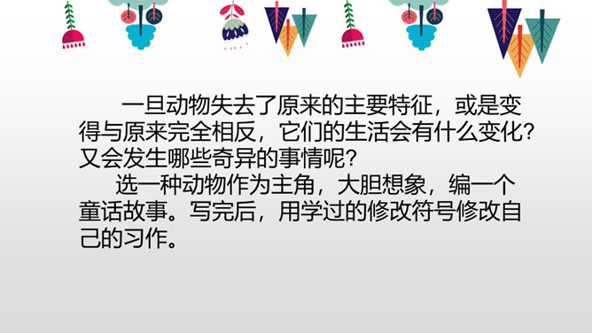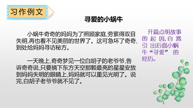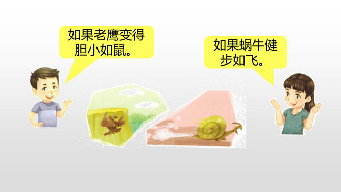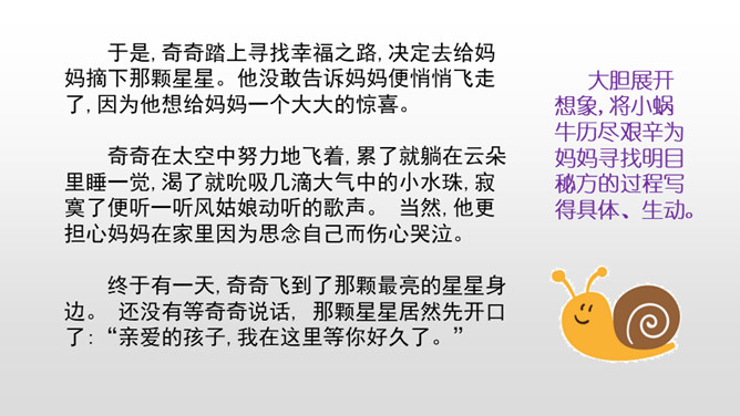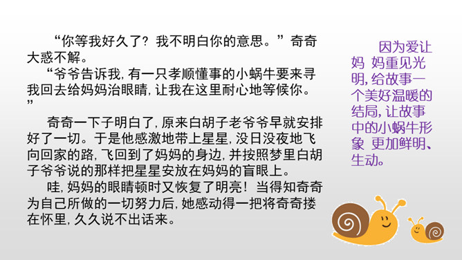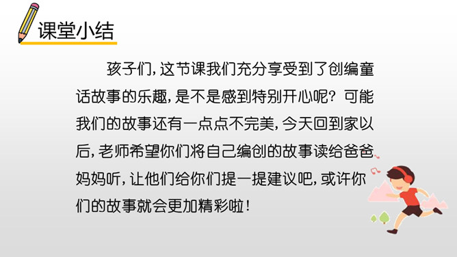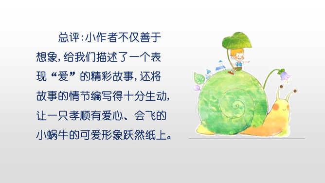 孩子们,这节课我们充分享受到了创编童话故事的乐趣,是不是感到特别开心呢? 可能我们的故事还有一点点不完美,今天回到家以后,老师希望你们将自己编创的故事读给爸爸妈妈听,让他们给你们提一提建议吧,或许你们的故事就会更加精彩啦!总评:小作者不仅善于想象,给我们描述了一个表现“爱”的精彩故事,还将故事的情节编写得十分生动,让一只孝顺有爱心、会飞的小蜗牛的可爱形象跃然纸上。所属专题:这样想象真有趣ppt。