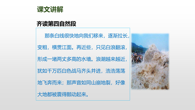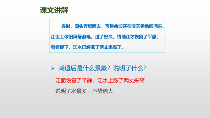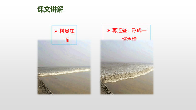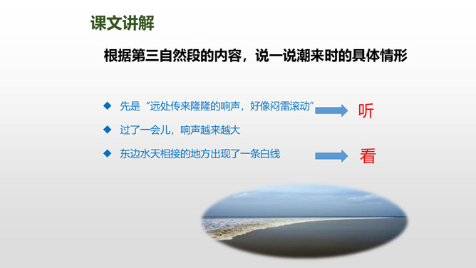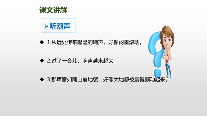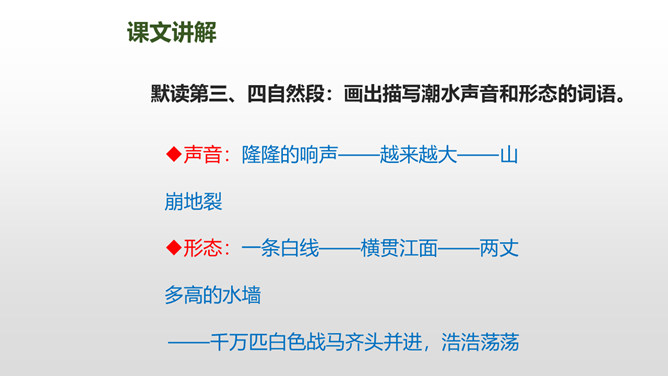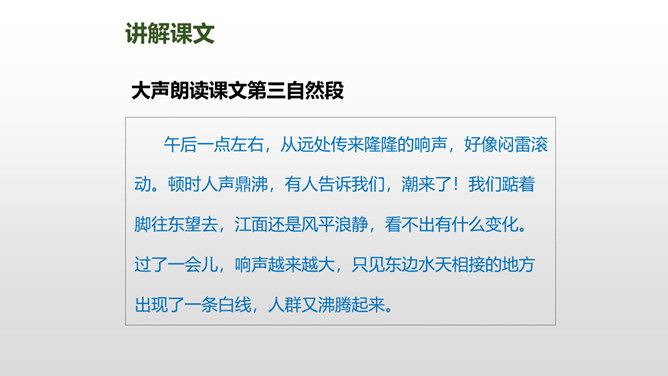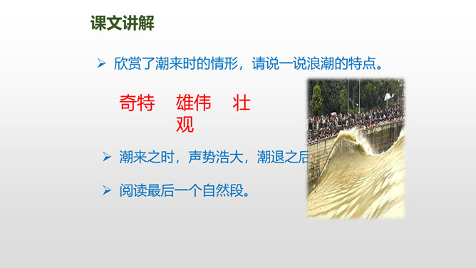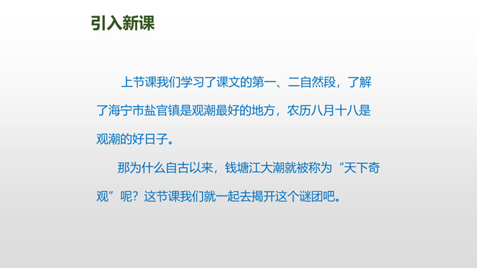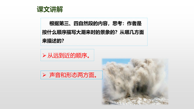 上节课我们学习了课文的第一、二自然段,了解了海宁市盐官镇是观潮最好的地方,农历八月十八是观潮的好日子。那为什么自古以来,钱塘江大潮就被称为“天下奇观”呢?这节课我们就一起去揭开这个谜团吧。根据第三自然段的内容,说一说潮来时的具体情形。根据第三、四自然段的内容,思考:作者是按什么顺序描写大潮来时的景象的?从哪几方面来描述的?从远到近的顺序。声音和形态两方面。所属专题:观潮ppt。
