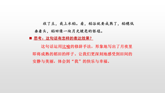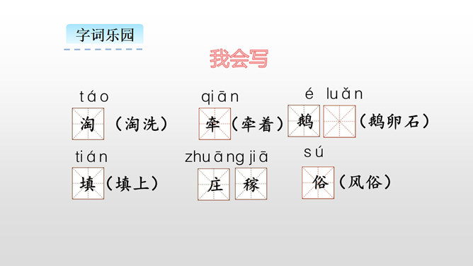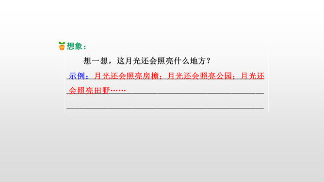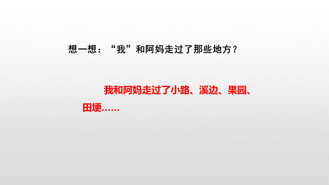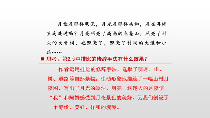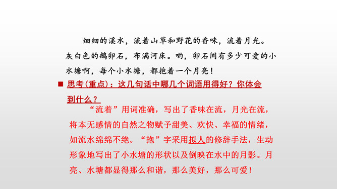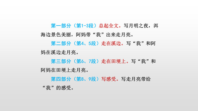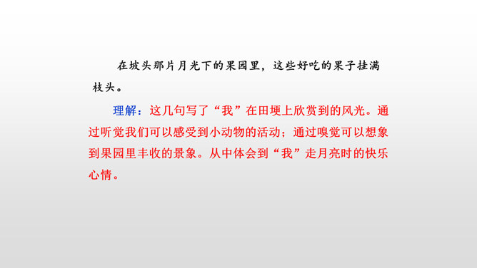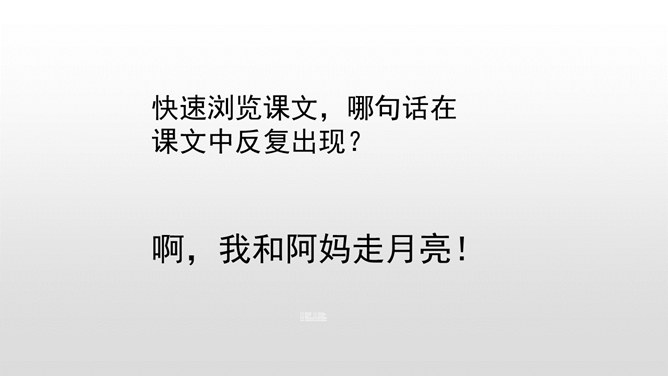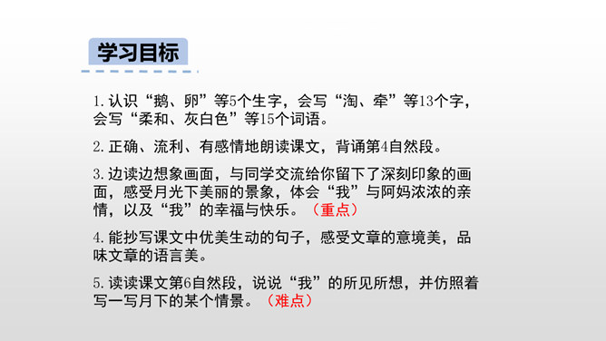 1.认识“鹅、卵”等5个生字,会写“淘、牵”等13个字,会写“柔和、灰白色”等15个词语。2.正确、流利、有感情地朗读课文,背诵第4自然段。3.边读边想象画面,与同学交流给你留下了深刻印象的画面,感受月光下美丽的景象,体会“我”与阿妈浓浓的亲情,以及“我”的幸福与快乐。(重点)4.能抄写课文中优美生动的句子,感受文章的意境美,品味文章的语言美。5.读读课文第6自然段,说说“我”的所见所想,并仿照着写一写月下的某个情景。所属专题:走月亮ppt。