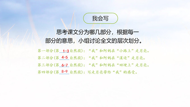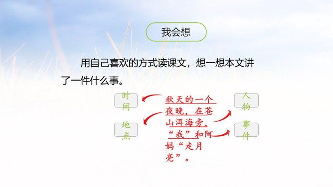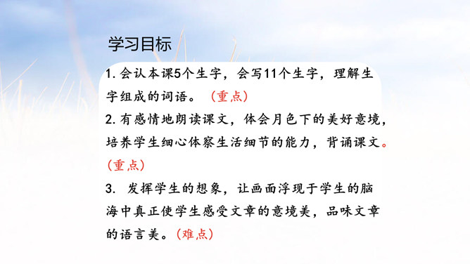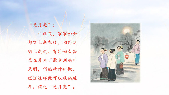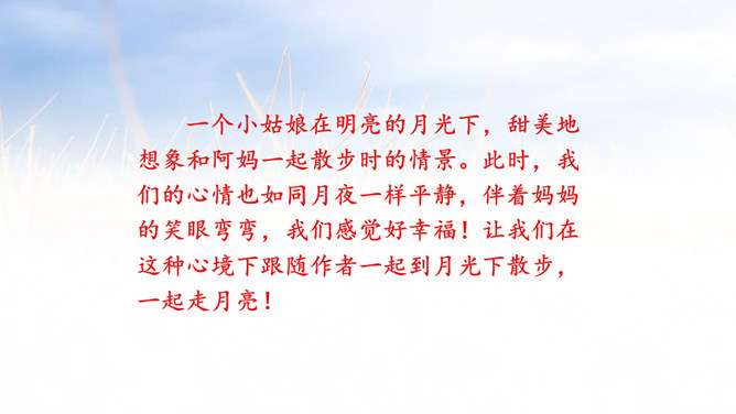 1.会认本课5个生字,会写11个生字,理解生字组成的词语。 (重点)2.有感情地朗读课文,体会月色下的美好意境,培养学生细心体察生活细节的能力,背诵课文。 (重点)3. 发挥学生的想象,让画面浮现于学生的脑海中真正使学生感受文章的意境美,品味文章的语言美。(难点)思考课文分为哪几部分,根据每一部分的意思,小组讨论全文的层次划分。每个民族都有自己的风俗习惯。所属专题:走月亮ppt。