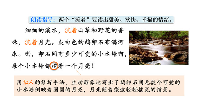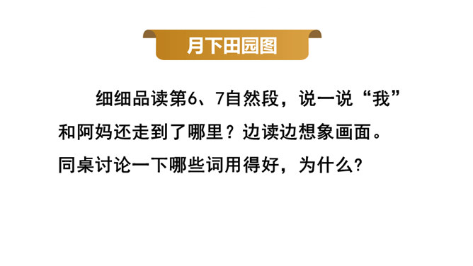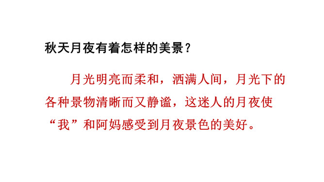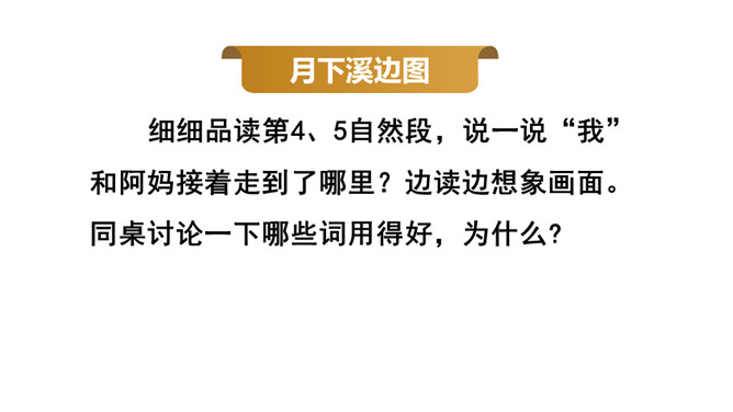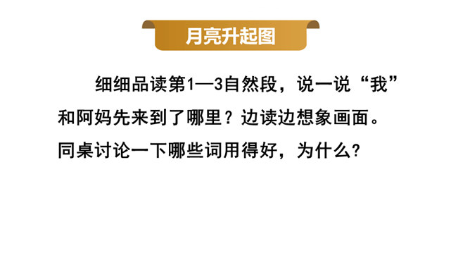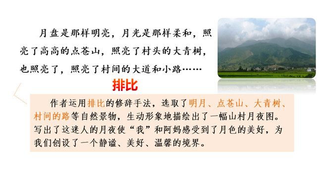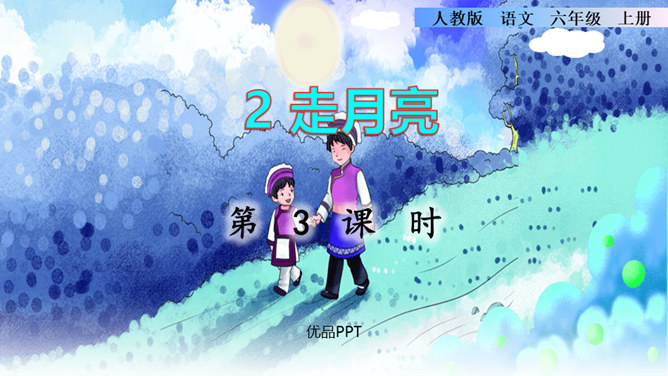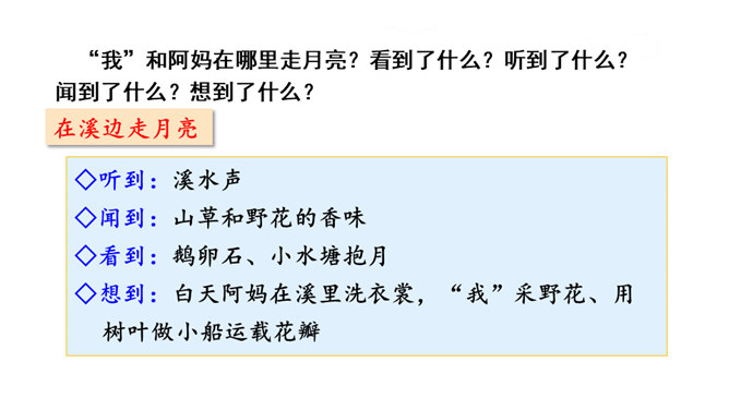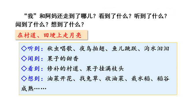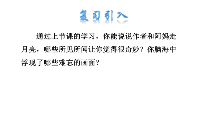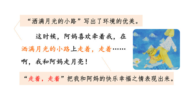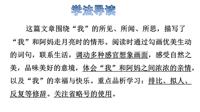 通过上节课的学习,你能说说作者和阿妈走月亮,哪些所见所闻让你觉得很奇妙?你脑海中浮现了哪些难忘的画面?这篇文章围绕“我”的所见、所闻、所思,描写了“我”和阿妈走月亮时的情形。阅读时通过勾画优美生动的词句,联系生活,调动多种感官想象画面,感受自然之美,品味美好的意境,体会“我”和阿妈之间浓浓的亲情,以及“我”的幸福与快乐。重点品析学习:排比、拟人、反复等修辞。关注省略号的使用。所属专题:走月亮ppt。