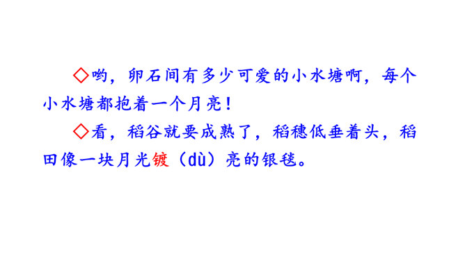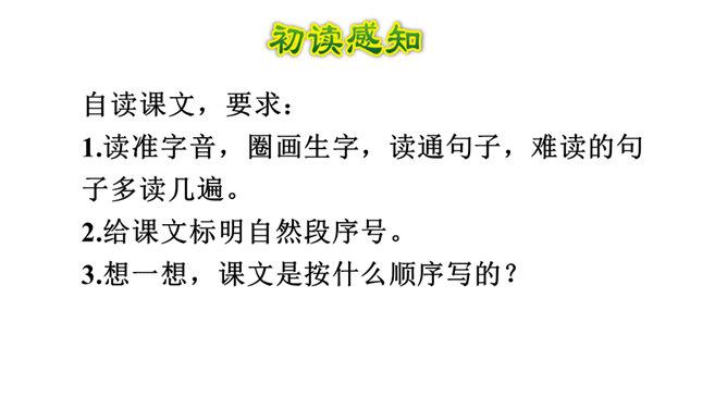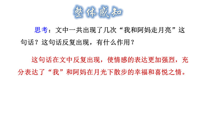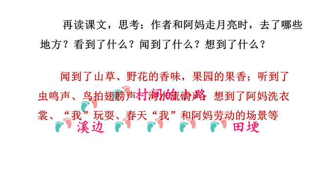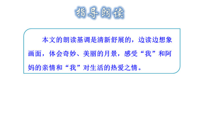 自读课文,要求:1.读准字音,圈画生字,读通句子,难读的句子多读几遍。2.给课文标明自然段序号。3.想一想,课文是按什么顺序写的?本文的朗读基调是清新舒展的,边读边想象画面,体会奇妙、美丽的月景,感受“我”和阿妈的亲情和“我”对生活的热爱之情。指名朗读课文,听评朗读效果。1.课文生字、多音字读音是否正确。2.朗读是否做到正确、流利。3.语速是否恰当,情感是否饱满。所属专题:走月亮ppt。
