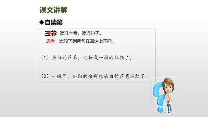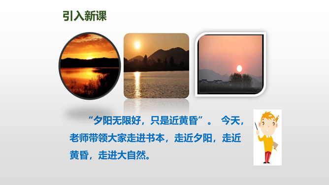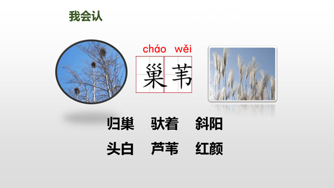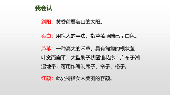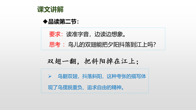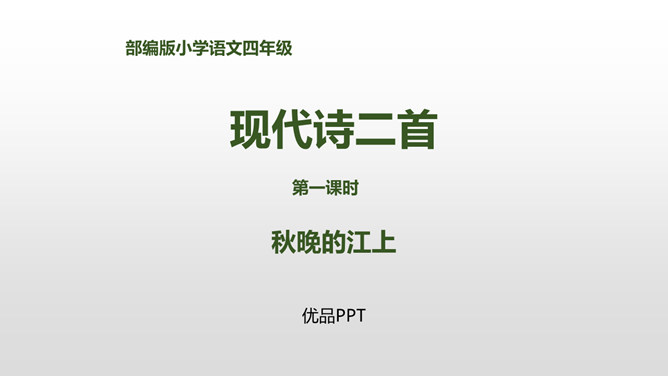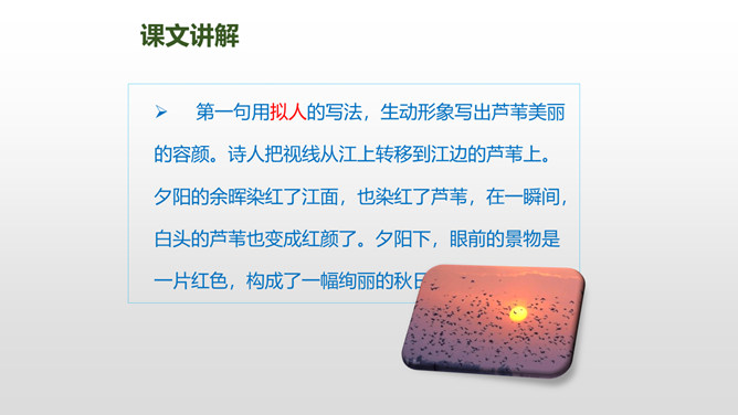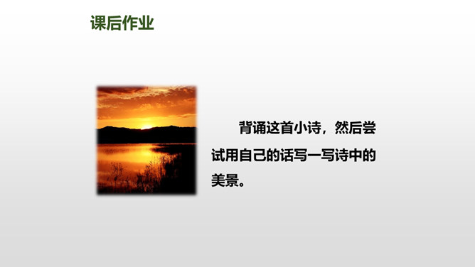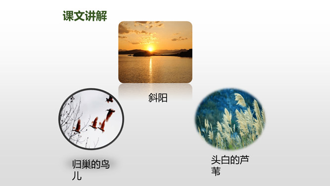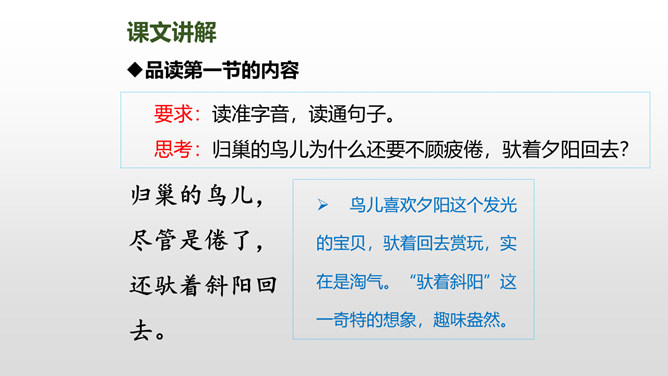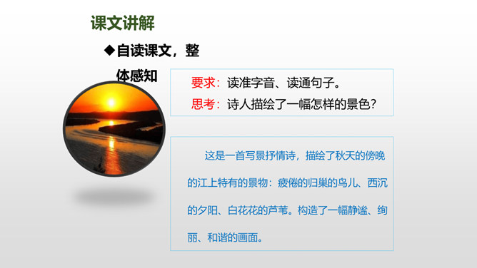 “夕阳无限好,只是近黄昏”。 今天,老师带领大家走进书本,走近夕阳,走近黄昏,走进大自然。要求:读准字音、读通句子。思考:诗人描绘了一幅怎样的景色?这是一首写景抒情诗,描绘了秋天的傍晚的江上特有的景物:疲倦的归巢的鸟儿、西沉的夕阳、白花花的芦苇。构造了一幅静谧、绚丽、和谐的画面。要求:读准字音,读通句子。思考:归巢的鸟儿为什么还要不顾疲倦,驮着夕阳回去?所属专题:秋晚的江上ppt。