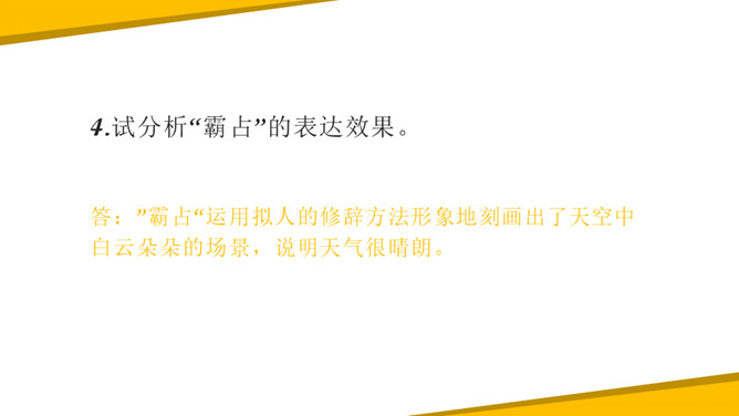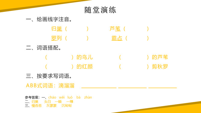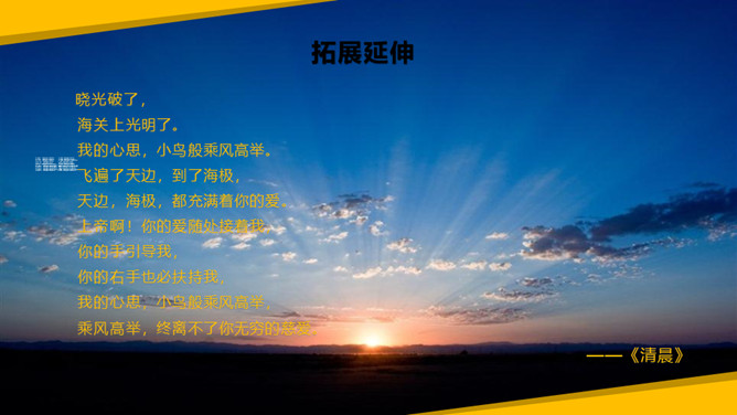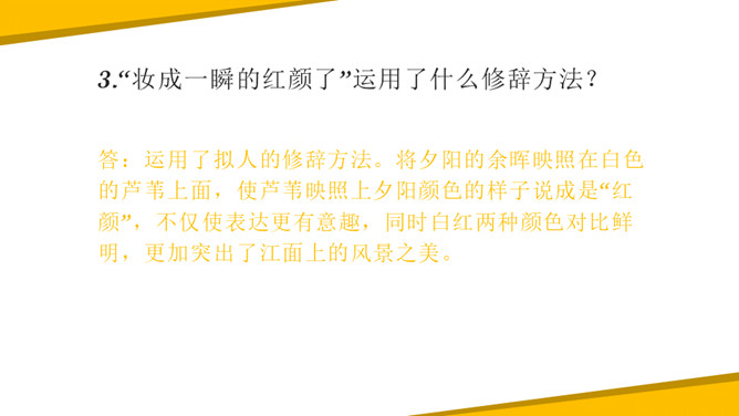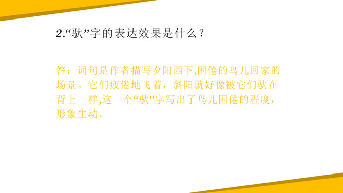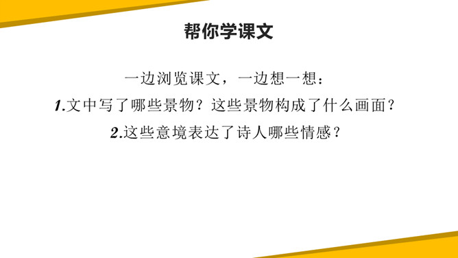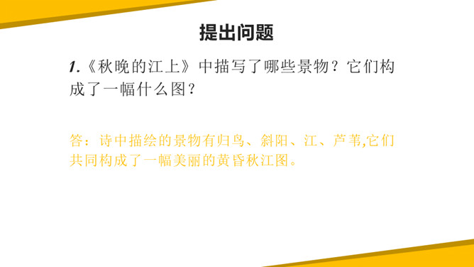 《秋晚的江上》中描写了哪些景物?它们构成了一幅什么图?答:诗中描绘的景物有归鸟、斜阳、江、芦苇,它们共同构成了一幅美丽的黄昏秋江图。“驮”字的表达效果是什么?答:词句是作者描写夕阳西下,困倦的鸟儿回家的场景。它们疲倦地飞着,斜阳就好像被它们驮在背上一样,这一个“驮”字写出了鸟儿困倦的程度,形象生动。一边浏览课文,一边想一想:1.文中写了哪些景物?这些景物构成了什么画面?2.这些意境表达了诗人哪些情感?