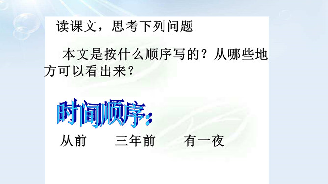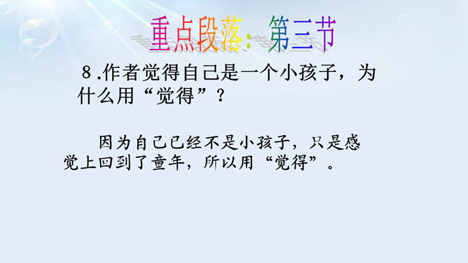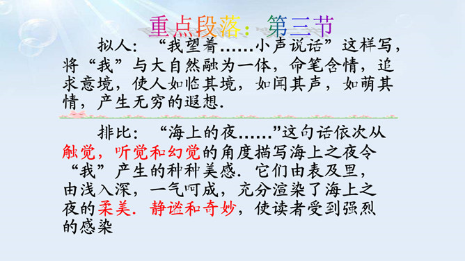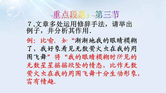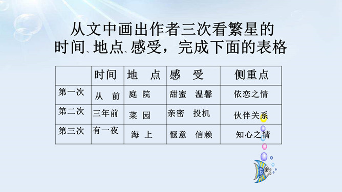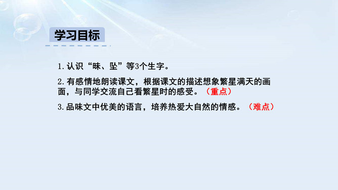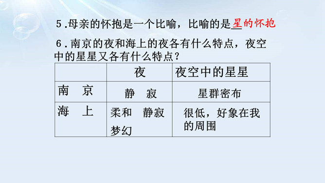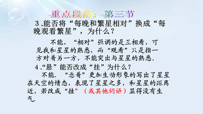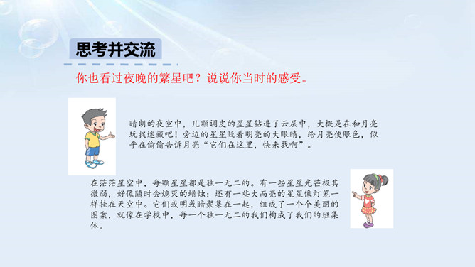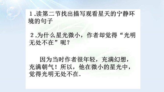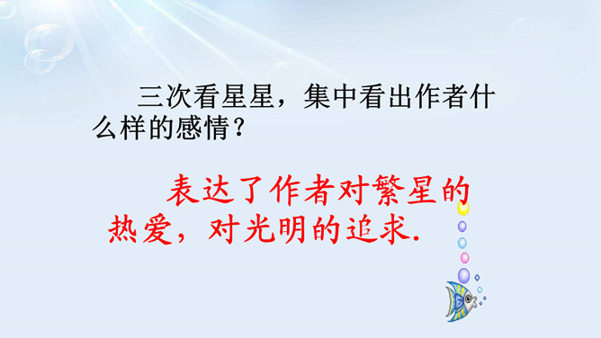 三次看星星,集中看出作者什么样的感情?表达了作者对繁星的热爱,对光明的追求。读第一节,思考:首句“我爱月夜,但我也爱星天”一句有何作用?表露作者对大自然的热爱之情,也为下句写我爱繁星做铺垫。读第二节找出描写观看星天的宁静环境的句子。为什么星光微小,作者却觉得“光明无处不在”呢?因为当时作者很年轻,充满幻想,充满朝气!所以,他在微小的星光中,觉得光明无处不在。所属专题:繁星ppt。