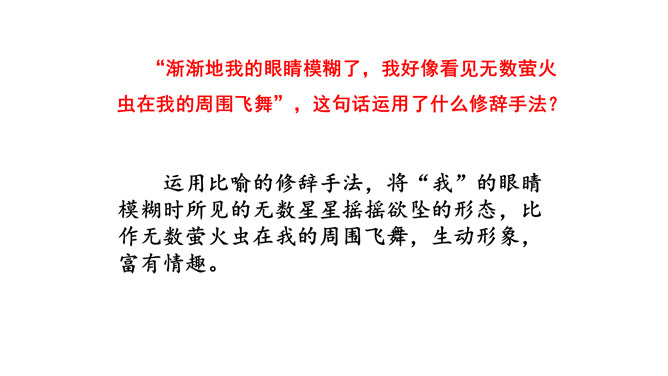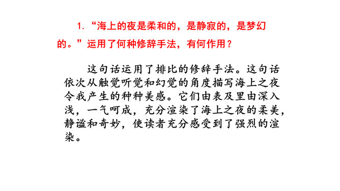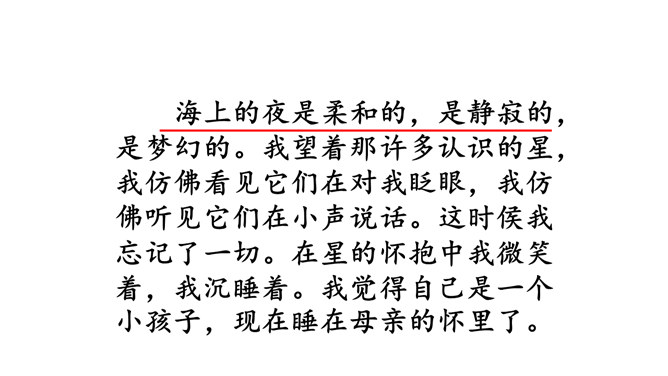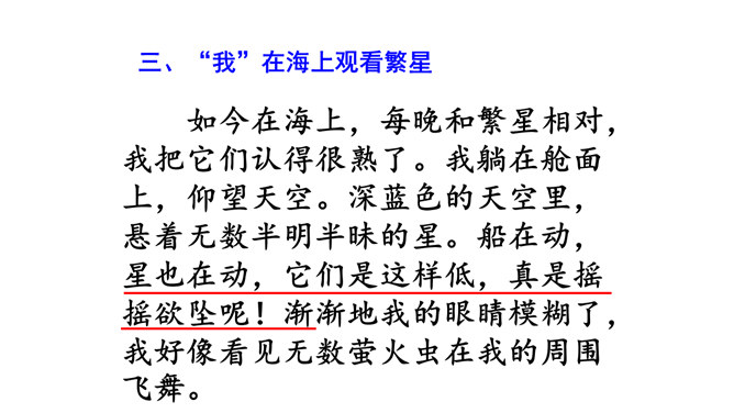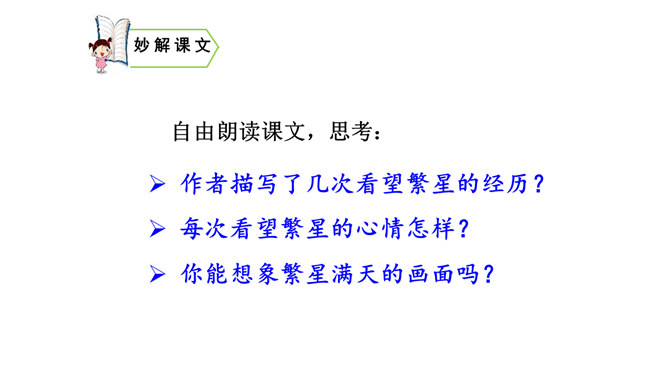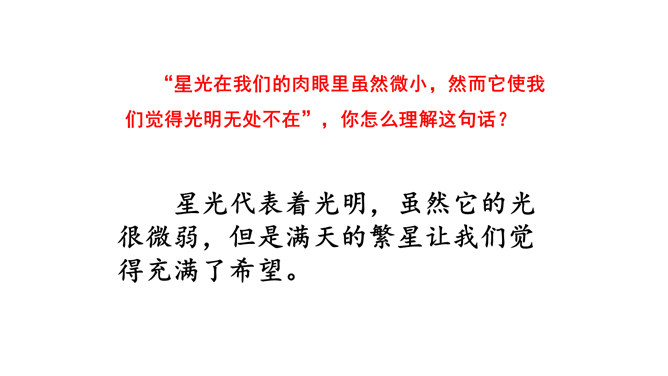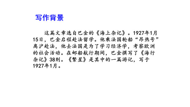 这篇短文,把遥远的星空写得如此美妙动人,从与星为友,到对星谈话,把星星拟人化了,因而使读者感到分外亲切。作者在三等舱餐厅中写的这篇游记,是寄给他哥哥看的,好让他们也能领略一些海行的乐趣。由于文章是用真情实感织成的,因而给人留下十分亲切、难忘的印象。对未来有种种设想,又有淡淡的乡愁,不由得又回忆起童年来了。 深情寓于景中,淡淡的,把握不定而又是可感的。 表达了作者对星空的热爱,对美好生活的向往,童心不减。所属专题:繁星ppt。