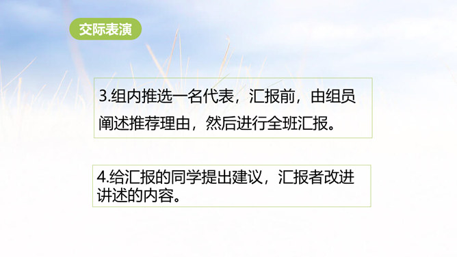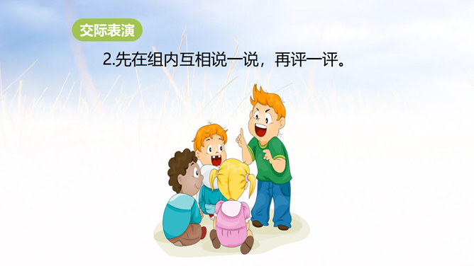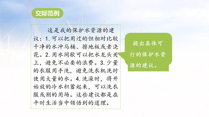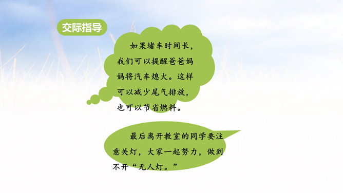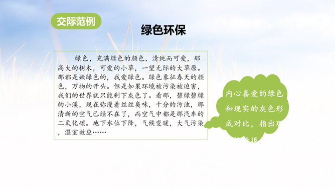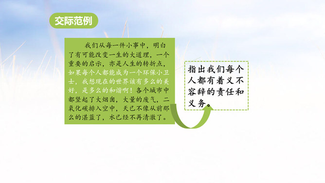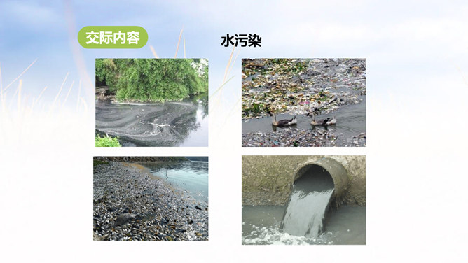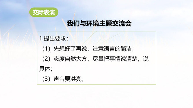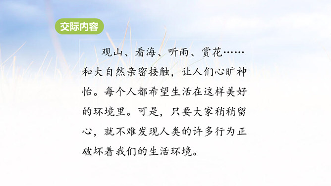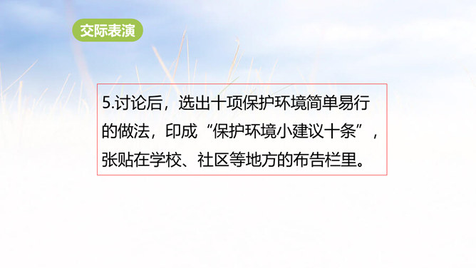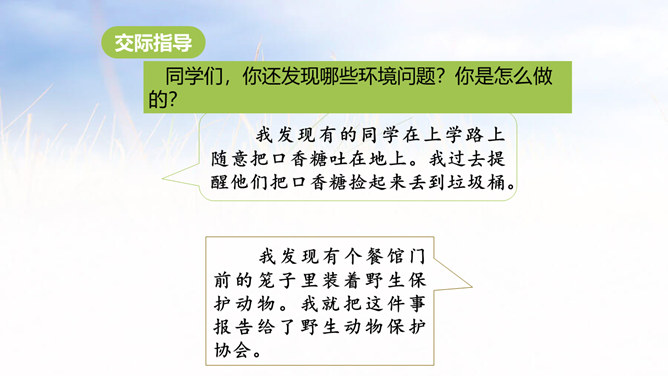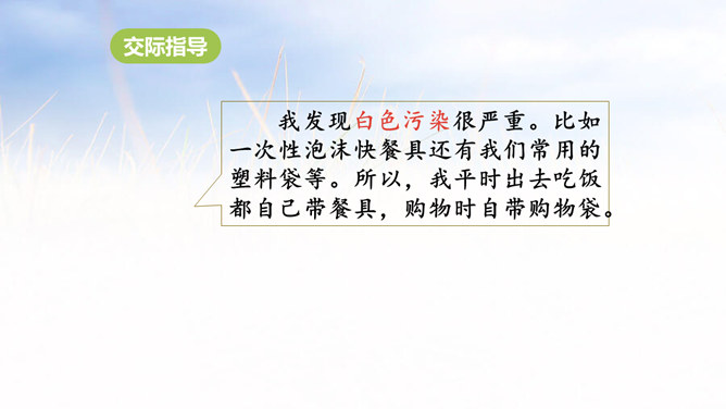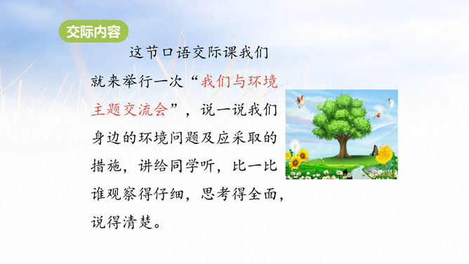 这节口语交际课我们就来举行一次“我们与环境主题交流会”,说一说我们身边的环境问题及应采取的措施,讲给同学听,比一比谁观察得仔细,思考得全面,说得清楚。1.引导学生仔细观察身边的环境问题,并能用简洁的语句概括出来。2.让学生充分意识到保护环境迫在眉睫,每一个人都应从身边做起,从我做起,做环保卫士。我发现白色污染很严重。比如一次性泡沫快餐具还有我们常用的塑料袋等。所以,购物时自带购物袋。
