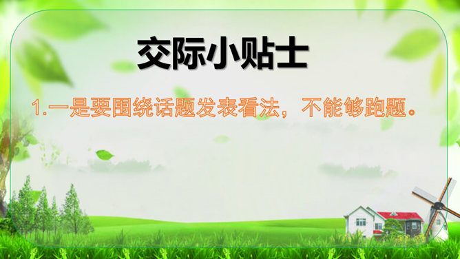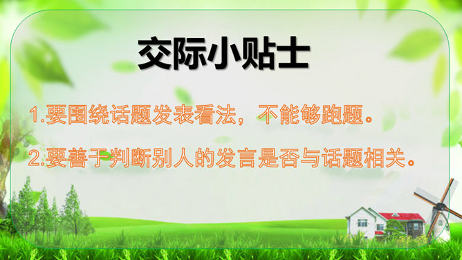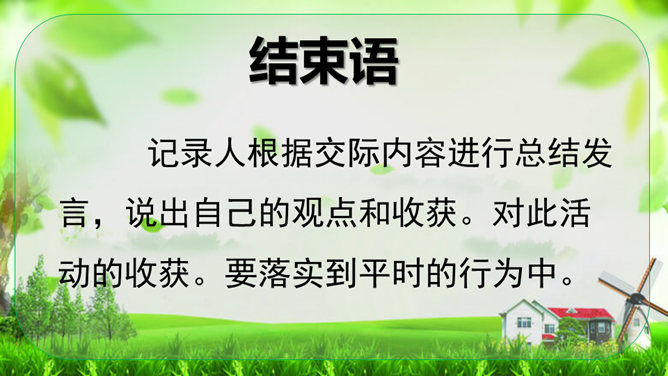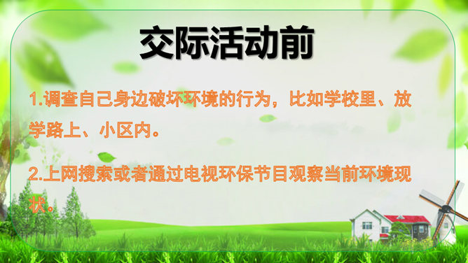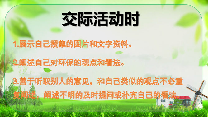 一是要围绕话题发表看法,不能够跑题。要善于判断别人的发言是否与话题相关。记录人根据交际内容进行总结发言,说出自己的观点和收获。对此活动的收获。要落实到平时的行为中。发现排污系统不完善的工厂时,随意砍伐树木等违法行为时,要及时向监管部门反映。从身边做起,从小事做起,保护环境人人有责。首先要做到自己不破坏环境,不乱扔垃圾。其次还要提醒周围的同学保护环境。