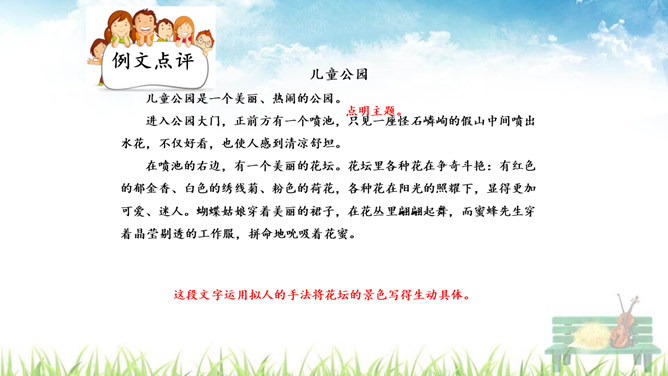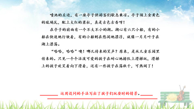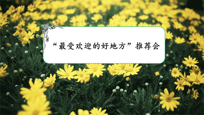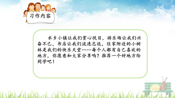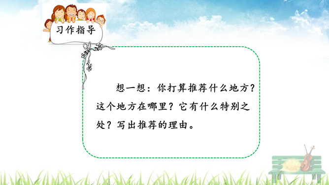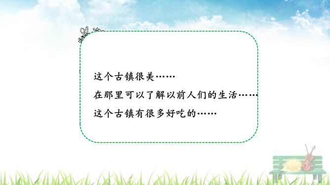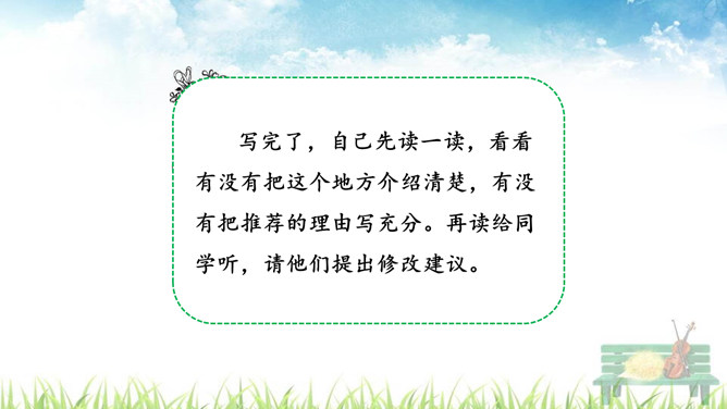 水乡小镇让我们赏心悦目,游乐场让我们兴奋不已,书店让我们流连忘返,住家附近的小树林是我们的快乐天堂……每个人都有自己喜欢的地方,你愿意和大家分享吗?推荐一个好地方给同学吧!想一想:你打算推荐什么地方?这个地方在哪里?它有什么特别之处?写出推荐的理由。这个古镇很美……在那里可以了解以前人们的生活……这个古镇有很多好吃的……写完了,自己先读一读,看看有没有把这个地方介绍清楚,有没有把推荐的理由写充分。再读给同学听,请他们提出修改建议。所属专题:推荐一个好地方ppt。