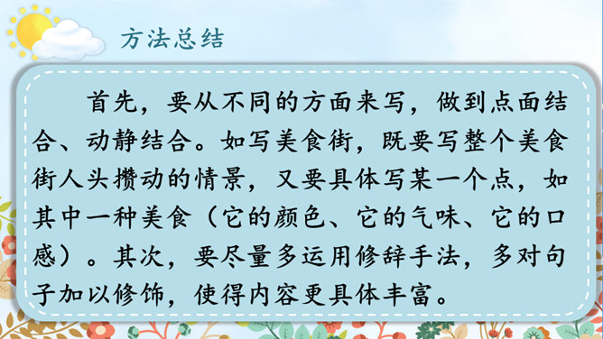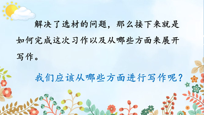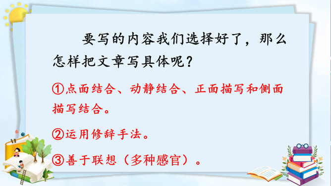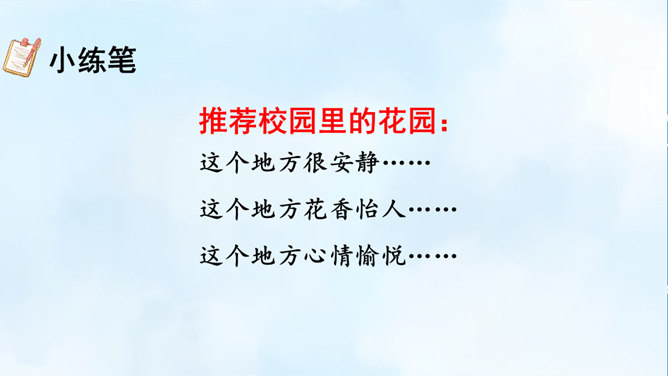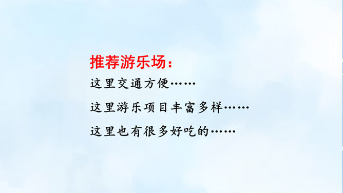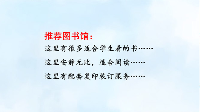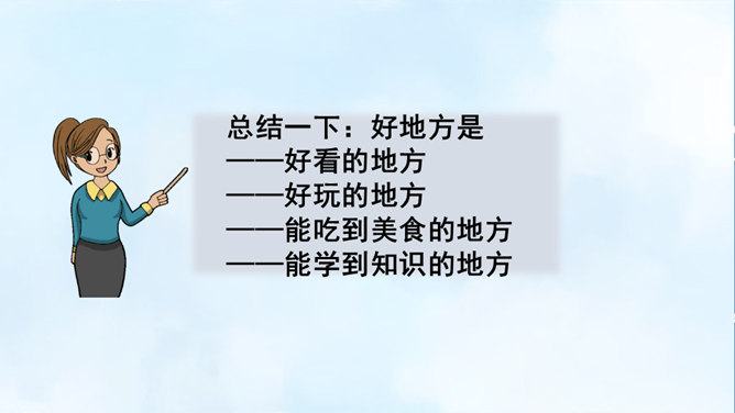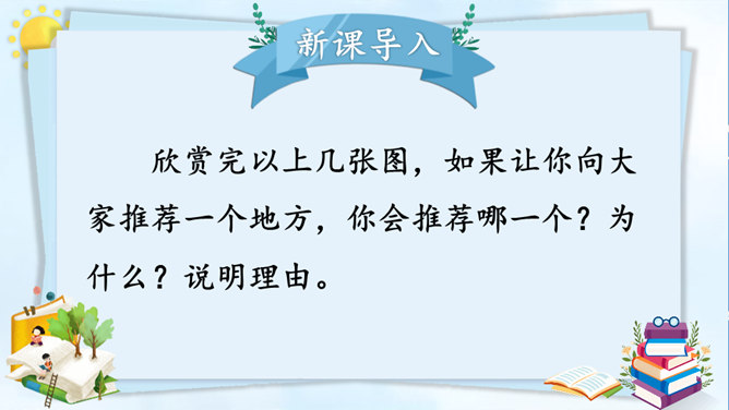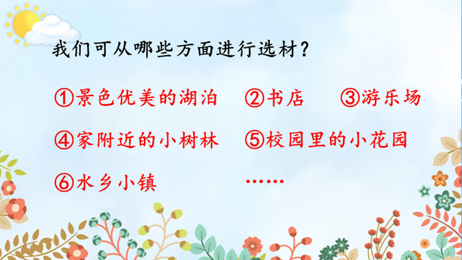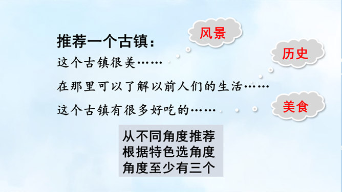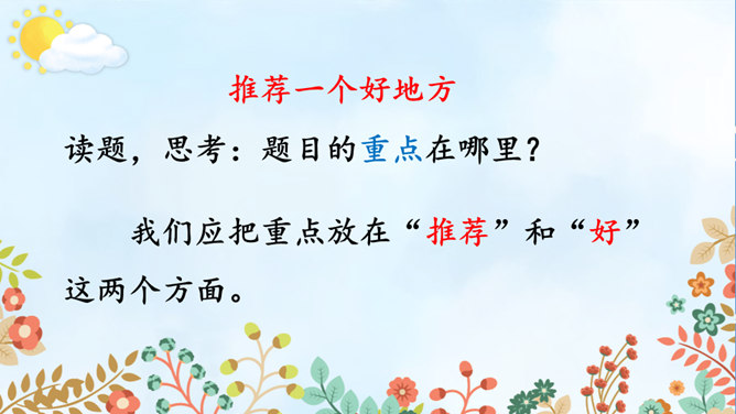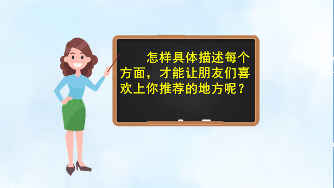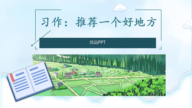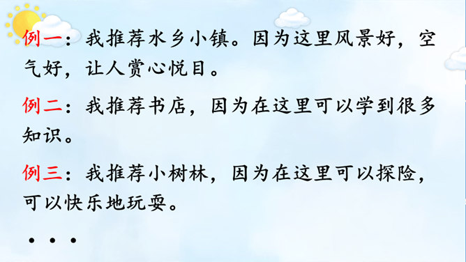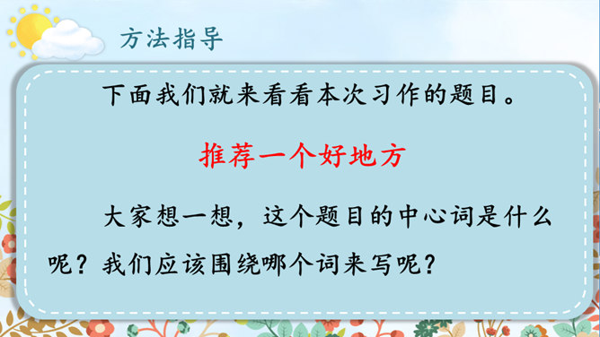 欣赏完以上几张图,如果让你向大家推荐一个地方,你会推荐哪一个?为什么?说明理由。例一:我推荐水乡小镇。因为这里风景好,空气好,让人赏心悦目。例二:我推荐书店,因为在这里可以学到很多知识。例三:我推荐小树林,因为在这里可以探险,可以快乐地玩耍。大家想一想,这个题目的中心词是什么呢?我们应该围绕哪个词来写呢?解决了选材的问题,那么接下来就是如何完成这次习作以及从哪些方面来展开写作。所属专题:推荐一个好地方ppt。