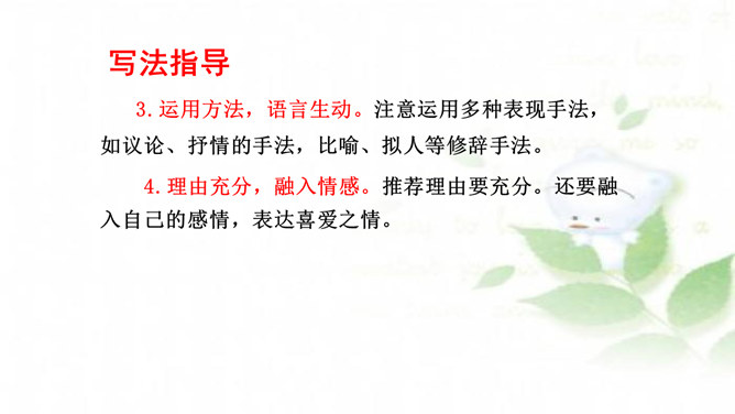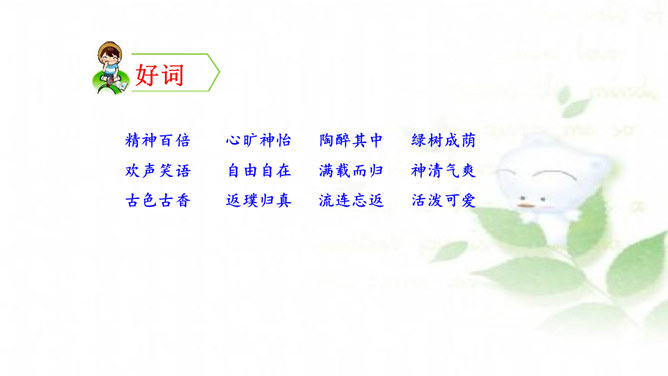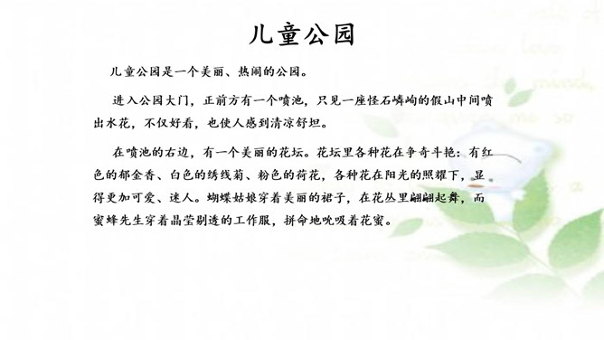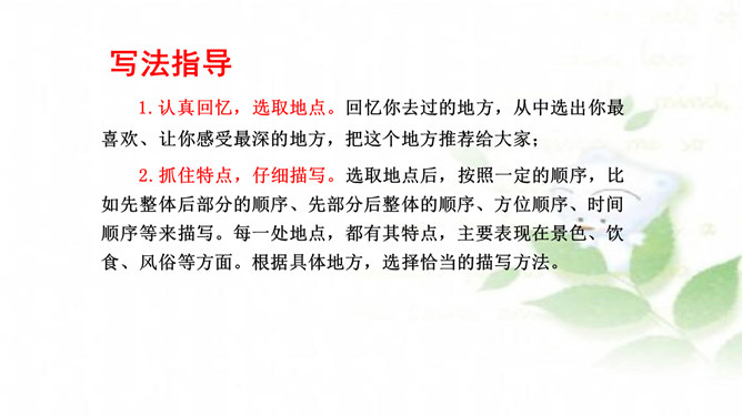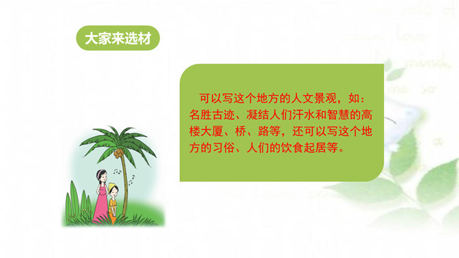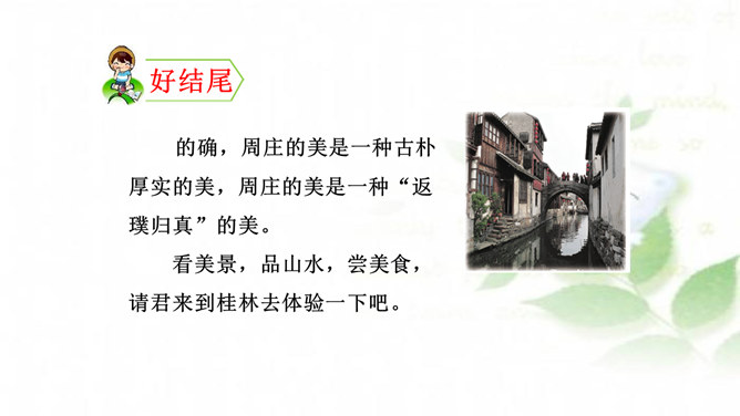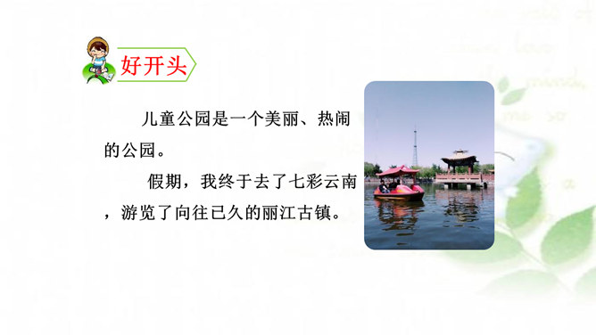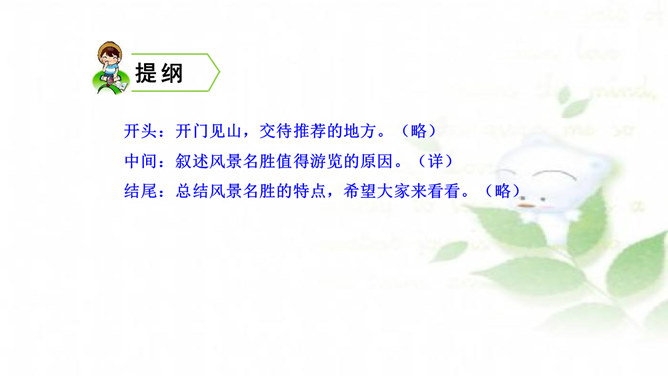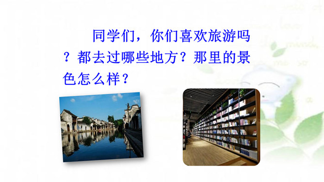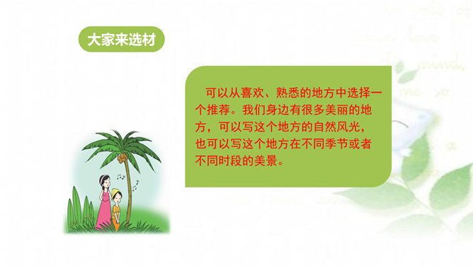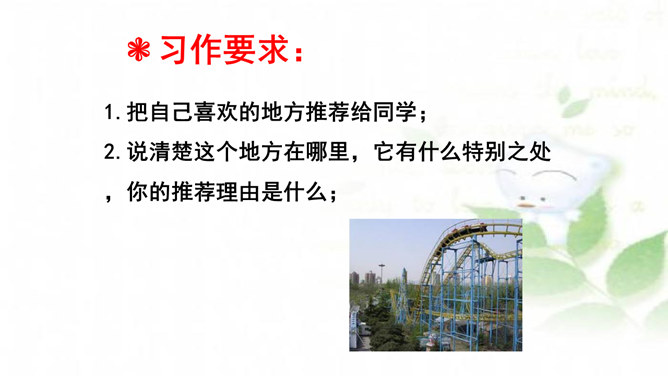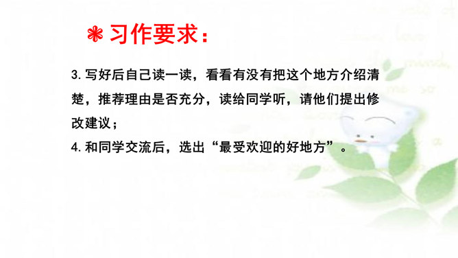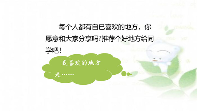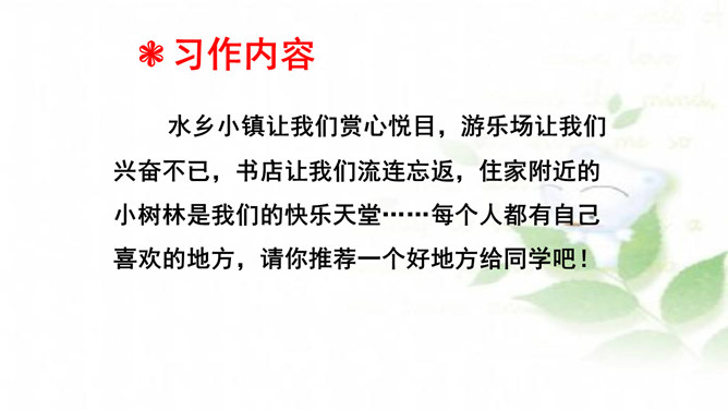 水乡小镇让我们赏心悦目,游乐场让我们兴奋不已,书店让我们流连忘返,住家附近的小树林是我们的快乐天堂……每个人都有自己喜欢的地方,请你推荐一个好地方给同学吧!1.把自己喜欢的地方推荐给同学;2.说清楚这个地方在哪里,它有什么特别之处,你的推荐理由是什么。可以从喜欢、熟悉的地方中选择一个推荐。我们身边有很多美丽的地方,可以写这个地方的自然风光,也可以写这个地方在不同季节或者不同时段的美景。所属专题:推荐一个好地方ppt。
