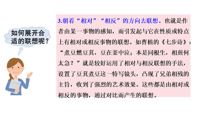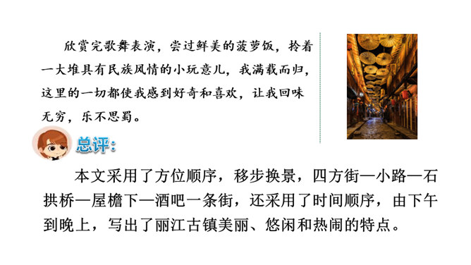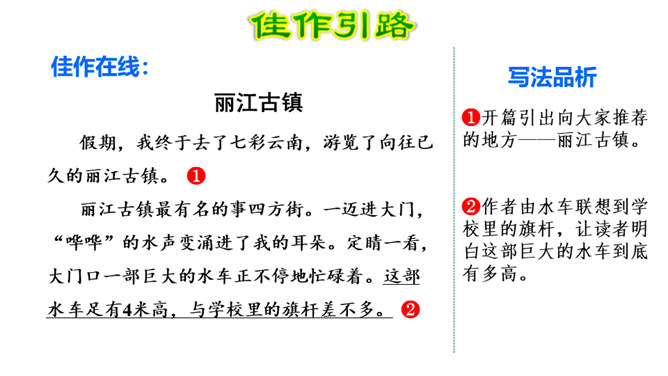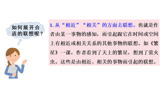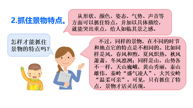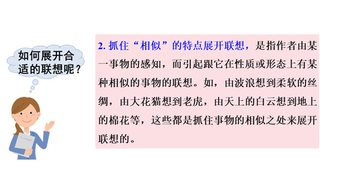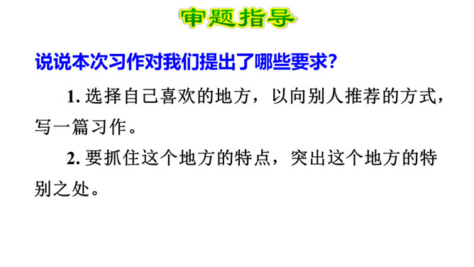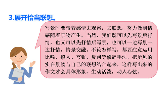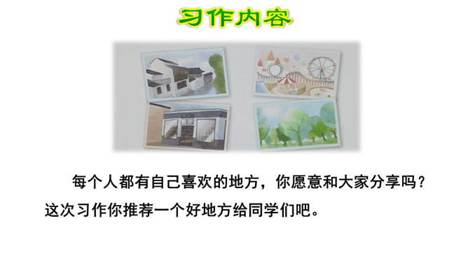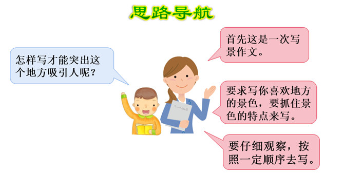 写景时要带着感情去观察,去联想,努力做到情感随着景物产生。当然,我们既可以先写景后抒情,也又可以先抒情后写景,也可以一边写景一边抒情,情景交融。不论怎样写,都要注意运用比喻、拟人、夸张、反问等修辞手法,把所见的实在景物与自己的联想结合起来,这样写出来的作文才会具体形象、生动活泼,动人心弦。也就是作者由某一事物的感知,而引起跟它在时间或空间上有相近或相关关系的其他事物的联想。所属专题:推荐一个好地方ppt。