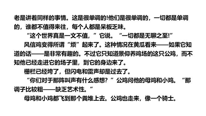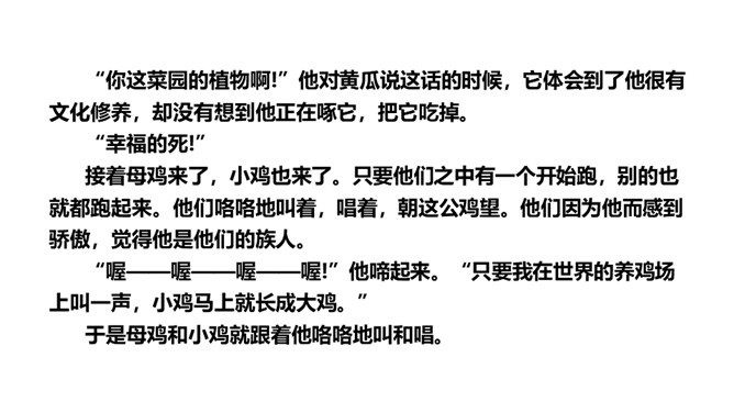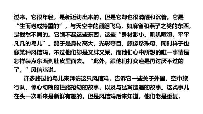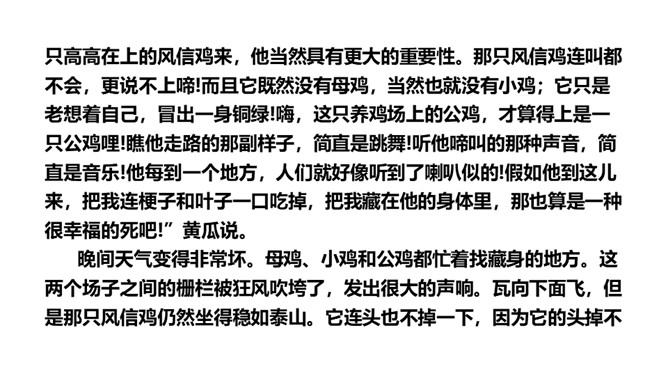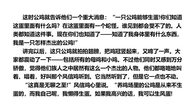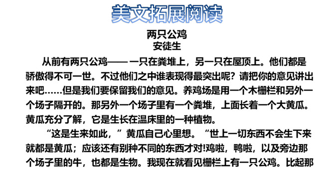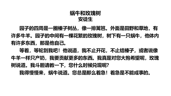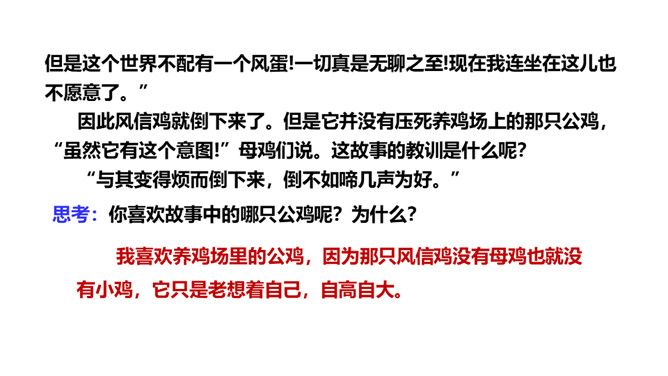 思考:读了这个故事,你能提出什么问题?思考:你喜欢故事中的哪只公鸡呢?为什么?我喜欢养鸡场里的公鸡,因为那只风信鸡没有母鸡也就没有小鸡,它只是老想着自己,自高自大。1.蜗牛和玫瑰树在一年里分别做着什么事?2.蜗牛对玫瑰树的生活持什么态度?玫瑰树又是怎样理解自己的生活的?3.你觉得蜗牛和玫瑰树分别代表了生活中的哪两类人?4.结尾两段有什么深刻的含义?作者为什么说故事“不会有两个样子的”?所属专题:一个豆荚里的五粒豆ppt。