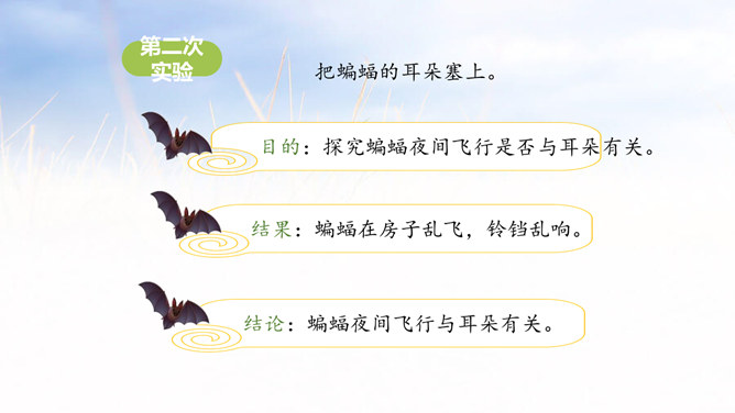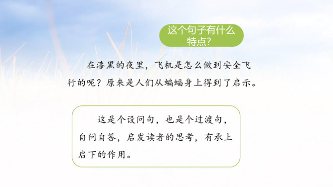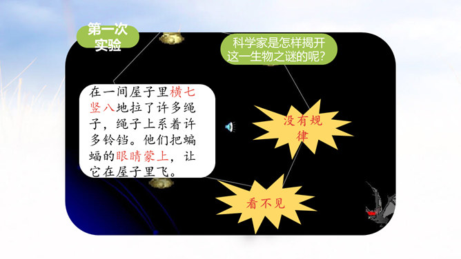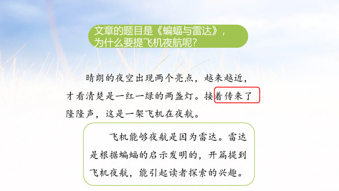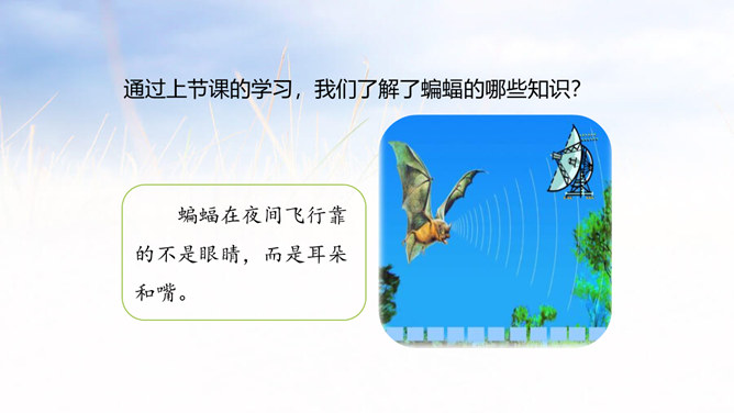 通过上节课的学习,我们了解了蝙蝠的哪些知识?飞机能够夜航是因为雷达。雷达是根据蝙蝠的启示发明的,开篇提到飞机夜航,能引起读者探索的兴趣。这是个设问句,也是个过渡句,自问自答,启发读者的思考,有承上启下的作用。采用问句的方法,引起读者探索的兴趣。说明科学家在研究的过程中历尽艰辛,经过多次研究才得出蝙蝠夜里飞行的秘密。这篇课文主要讲科学家通过反复实验,揭开了蝙蝠能在夜间飞行的原因,并从中受到启发,给飞机装上了雷达,解决了飞机在夜间飞行的问题。所属专题:蝙蝠和雷达ppt。