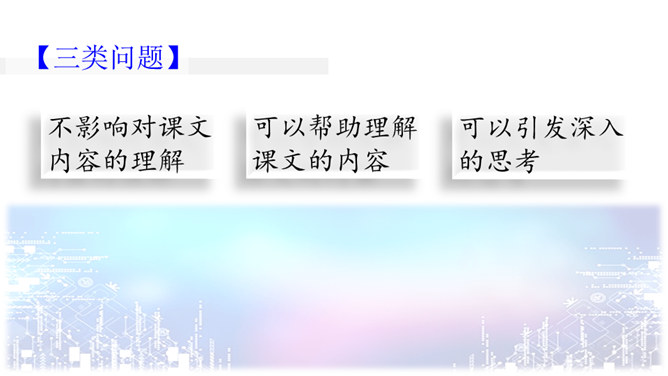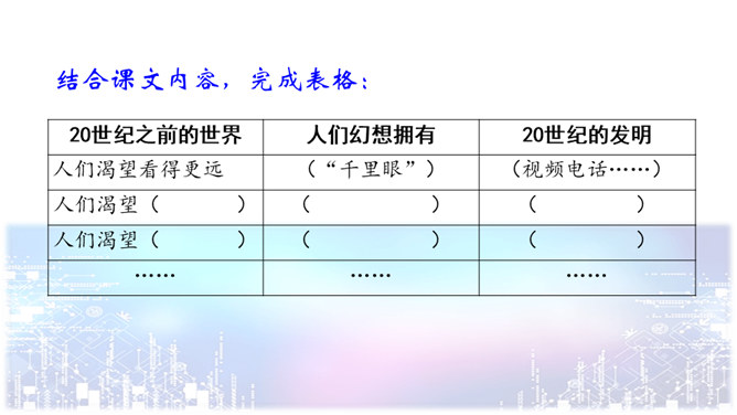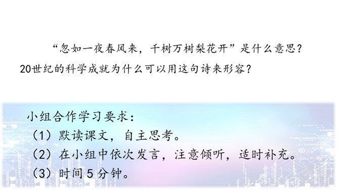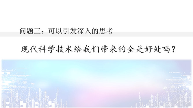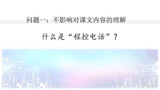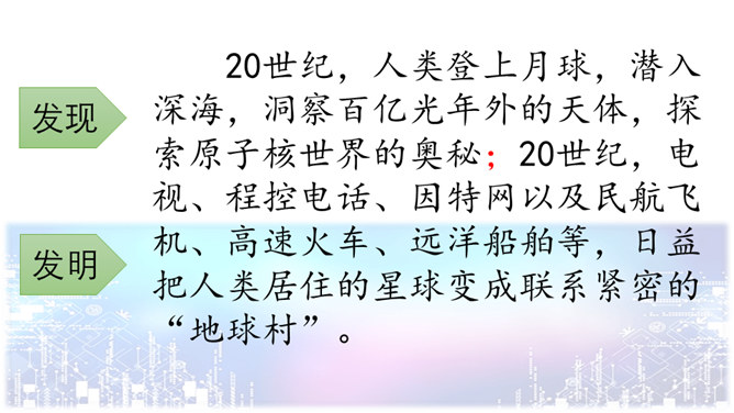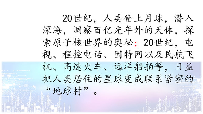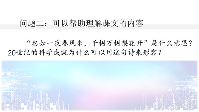 问题一:不影响对课文内容的理解。什么是“程控电话”?问题二:可以帮助理解课文的内容。“忽如一夜春风来,千树万树梨花开”是什么意思?20世纪的科学成就为什么可以用这句诗来形容?问题三:可以引发深入的思考。现代科学技术给我们带来的全是好处吗?这些发现与发明日益把人类居住的星球变成联系紧密的“地球村”。这个地球村已经把全世界都联系在一起了。所属专题:呼风唤雨的世纪ppt。