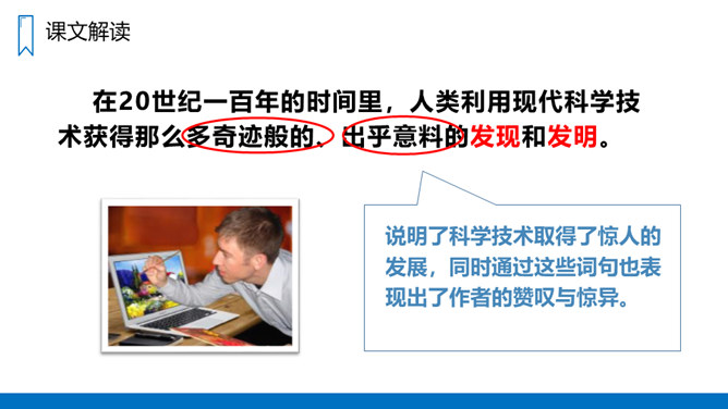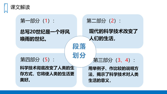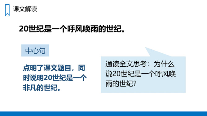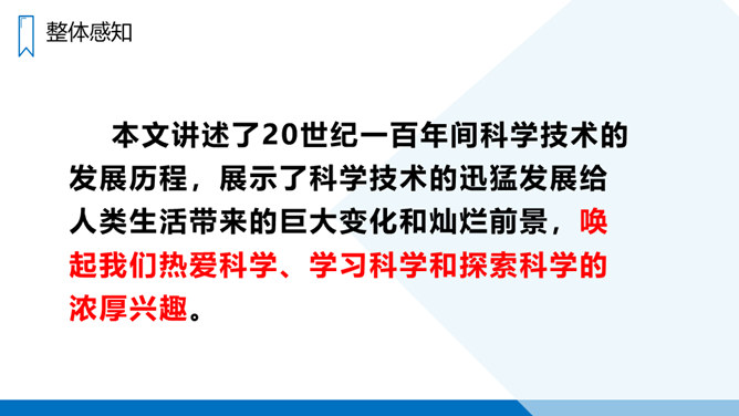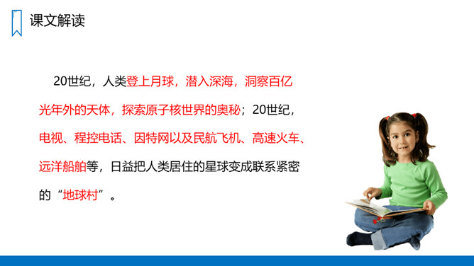 本文讲述了20世纪一百年间科学技术的发展历程,展示了科学技术的迅猛发展给人类生活带来的巨大变化和灿烂前景,唤起我们热爱科学、学习科学和探索科学的浓厚兴趣。“地球村”指什么?为什么人类居住的星球会变成“地球村”呢?你从中体会到了什么?进入二十一世纪,你觉得科学技术还会怎样改变我们的生活呢?同学们一起来畅想一下我们的未来生活,想一想未来的生活会是怎样的?所属专题:呼风唤雨的世纪ppt。
