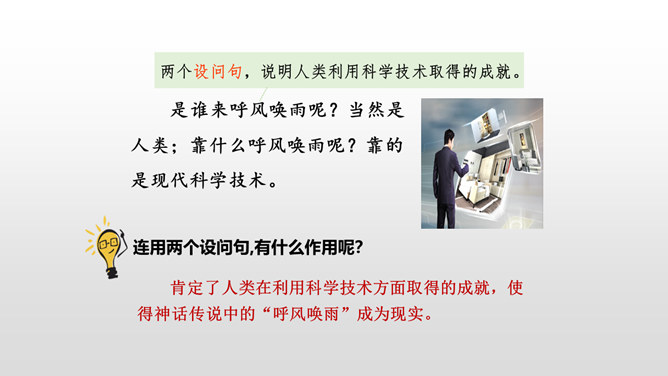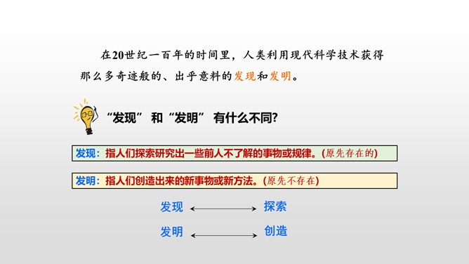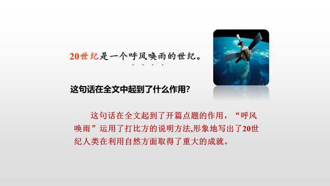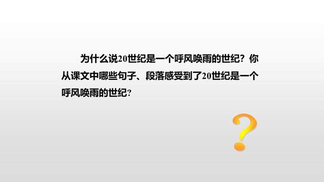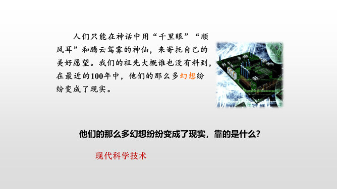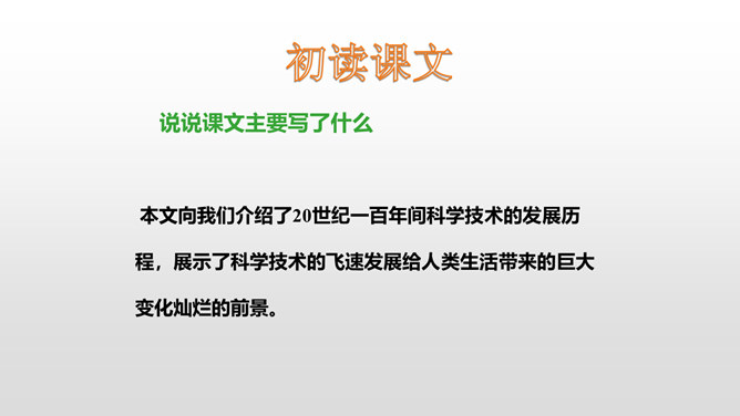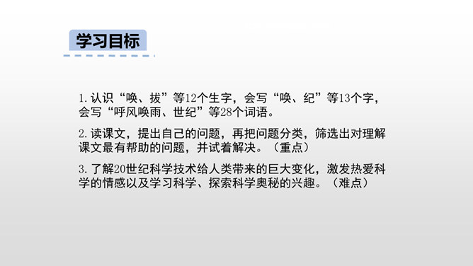 了解20世纪科学技术给人类带来的巨大变化,激发热爱科学的情感以及学习科学、探索科学奥秘的兴趣。读课文,提出自己的问题,再把问题分类,筛选出对理解课文最有帮助的问题,并试着解决。本文向我们介绍了20世纪一百年间科学技术的发展历程,展示了科学技术的飞速发展给人类生活带来的巨大变化灿烂的前景。为什么说20世纪是一个呼风唤雨的世纪?你从课文中哪些句子、段落感受到了20世纪是一个呼风唤雨的世纪?所属专题:呼风唤雨的世纪ppt。