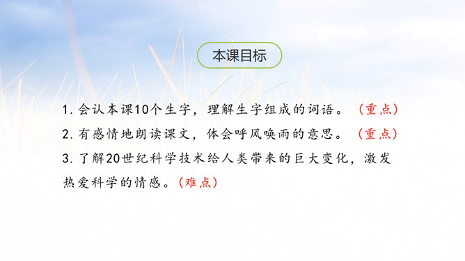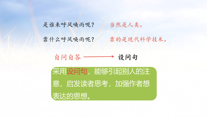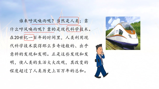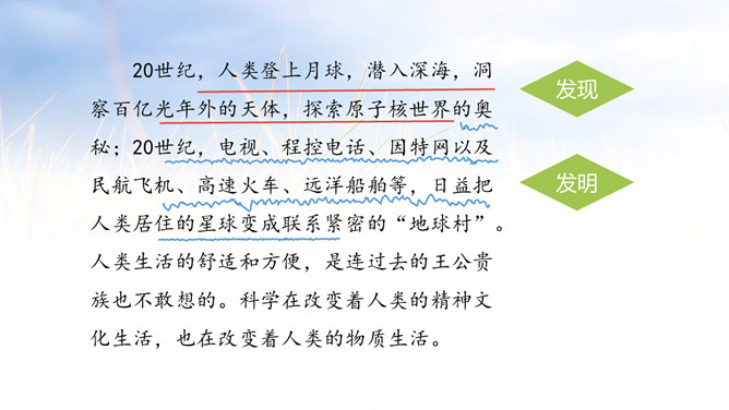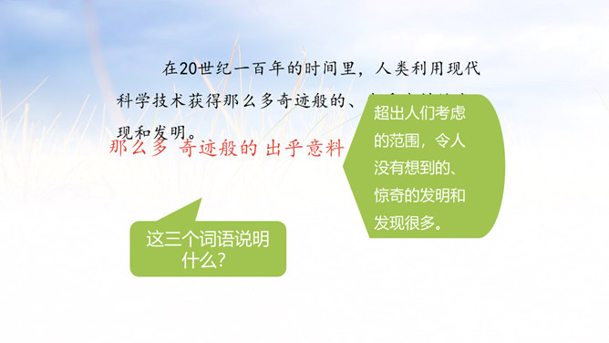 采用设问句,能够引起别人的注意,启发读者思考,加强作者想表达的思想。超出人们考虑的范围,令人没有想到的、惊奇的发明和发现很多。这些发现和发明对人类生活有哪些影响呢?找出相关语句读一读。小组讨论:请联系生活实际想一想,人类的哪些发现或发明改变了人类的生活,使人类的生活越来越舒适、方便?(点名说一说)诗句中的“春风”和“梨花”是真的春风和梨花吗?分别是指什么?所属专题:呼风唤雨的世纪ppt。