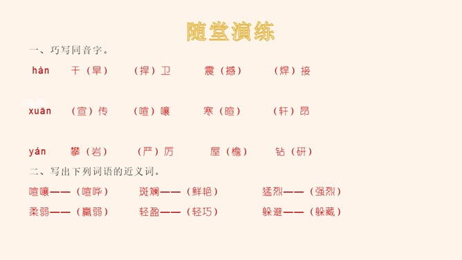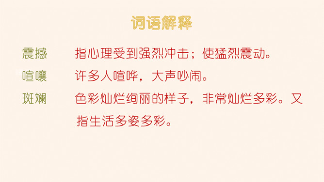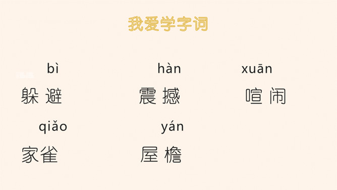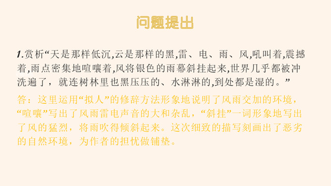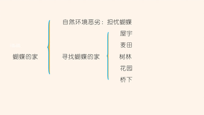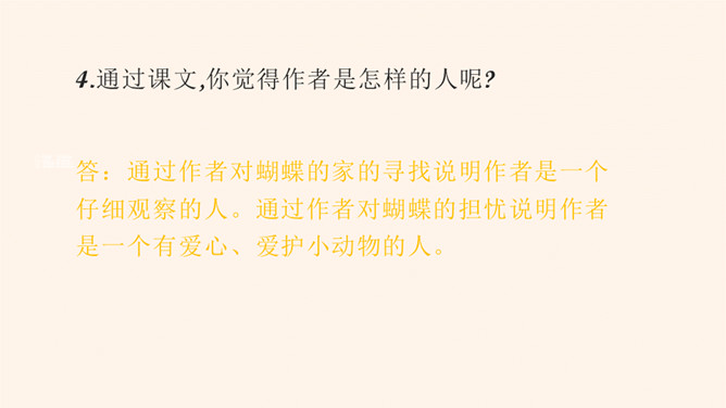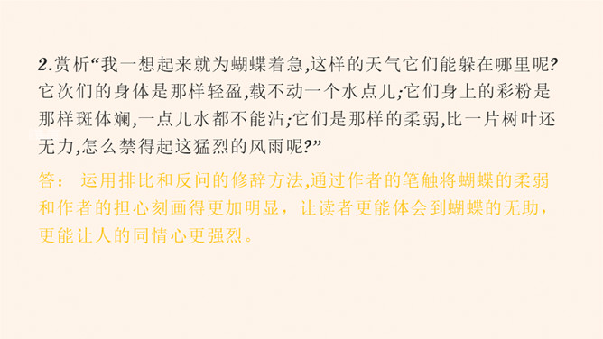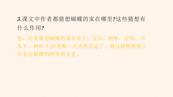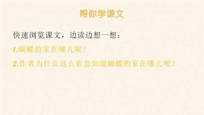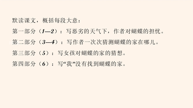 快速浏览课文,边读边想一想:1.蝴蝶的家在哪儿呢?2.作者为什么这么着急知道蝴蝶的家在哪儿呢?默读课文,概括每段大意:第一部分(1—2):写恶劣的天气下,作者对蝴蝶的担忧。第二部分(3—4):写作者一次次猜测蝴蝶的家在哪儿。第三部分(5):写女孩对蝴蝶的家的猜想。第四部分(6):写“我”没有找到蝴蝶的家。这里运用“拟人”的修辞方法形象地说明了风雨交加的环境,“喧嚷”写出了风雨雷电声音的大和杂乱。所属专题:蝴蝶的家ppt。