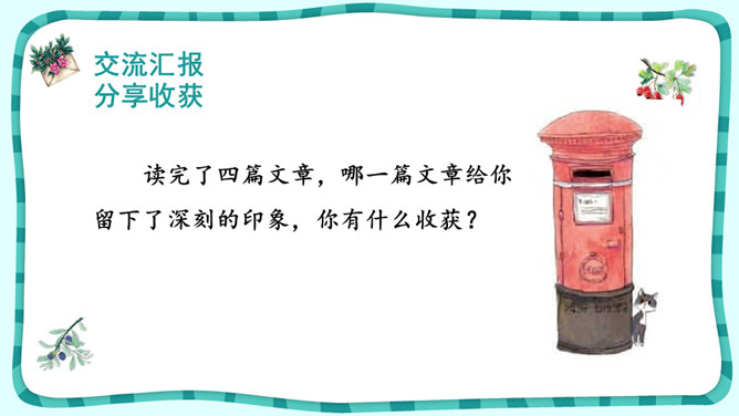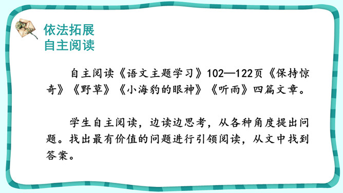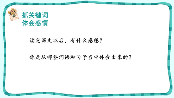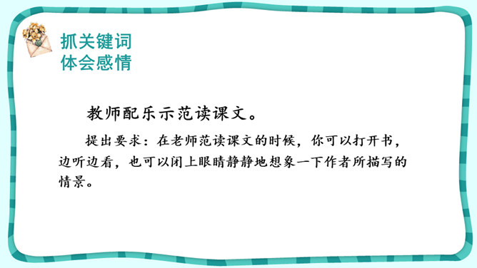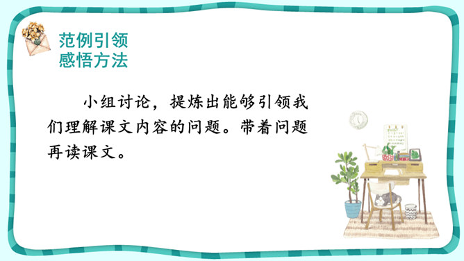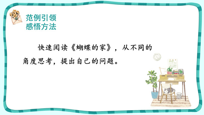 小组讨论,提炼出能够引领我们理解课文内容的问题。带着问题再读课文。教师配乐示范读课文。提出要求:在老师范读课文的时候,你可以打开书,边听边看,也可以闭上眼睛静静地想象一下作者所描写的情景。读完课文以后,有什么感想?你是从哪些词语和句子当中体会出来的?边读边思考,从不同的角度提出自己的问题,给问题分类,找出主要的、有价值的问题,然后通过读文解决问题,以问题为引领,深入阅读文章,这是一种阅读方法。所属专题:蝴蝶的家ppt。