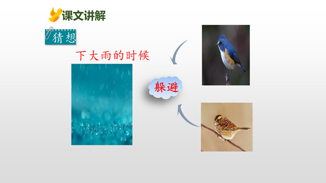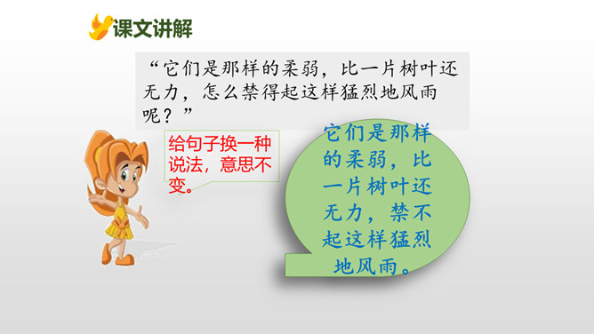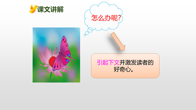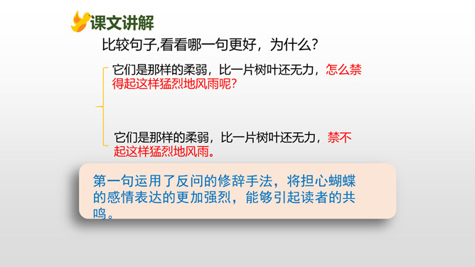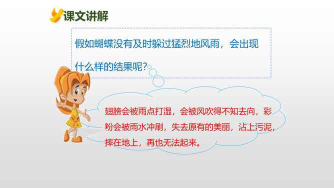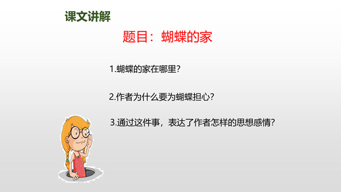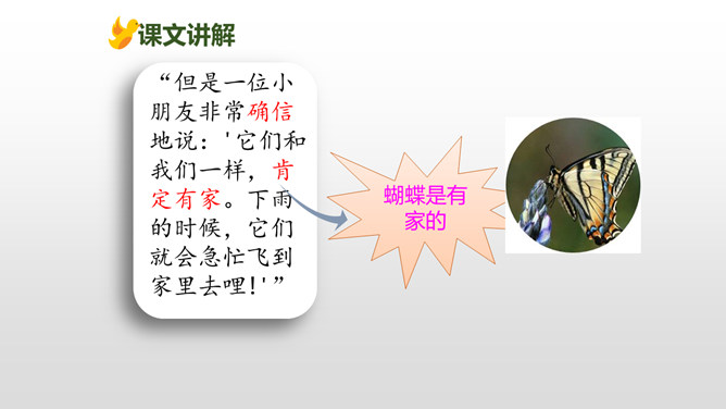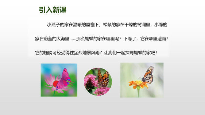 小燕子的家在温暖的屋檐下,松鼠的家在干燥的树洞里,小雨的家在蔚蓝的大海里……那么蝴蝶的家在哪里呢?下雨了,它在哪里避雨?它的翅膀可经受得住猛烈地暴风雨?让我们一起探寻蝴蝶的家吧!1.蝴蝶的家在哪里?2.作者为什么要为蝴蝶担心?3.通过这件事,表达了作者怎样的思想感情?它们是那样的柔弱,比一片树叶还无力,禁不起这样猛烈地风雨。第一句运用了反问的修辞手法,将担心蝴蝶的感情表达的更加强烈,能够引起读者的共鸣。所属专题:蝴蝶的家ppt。